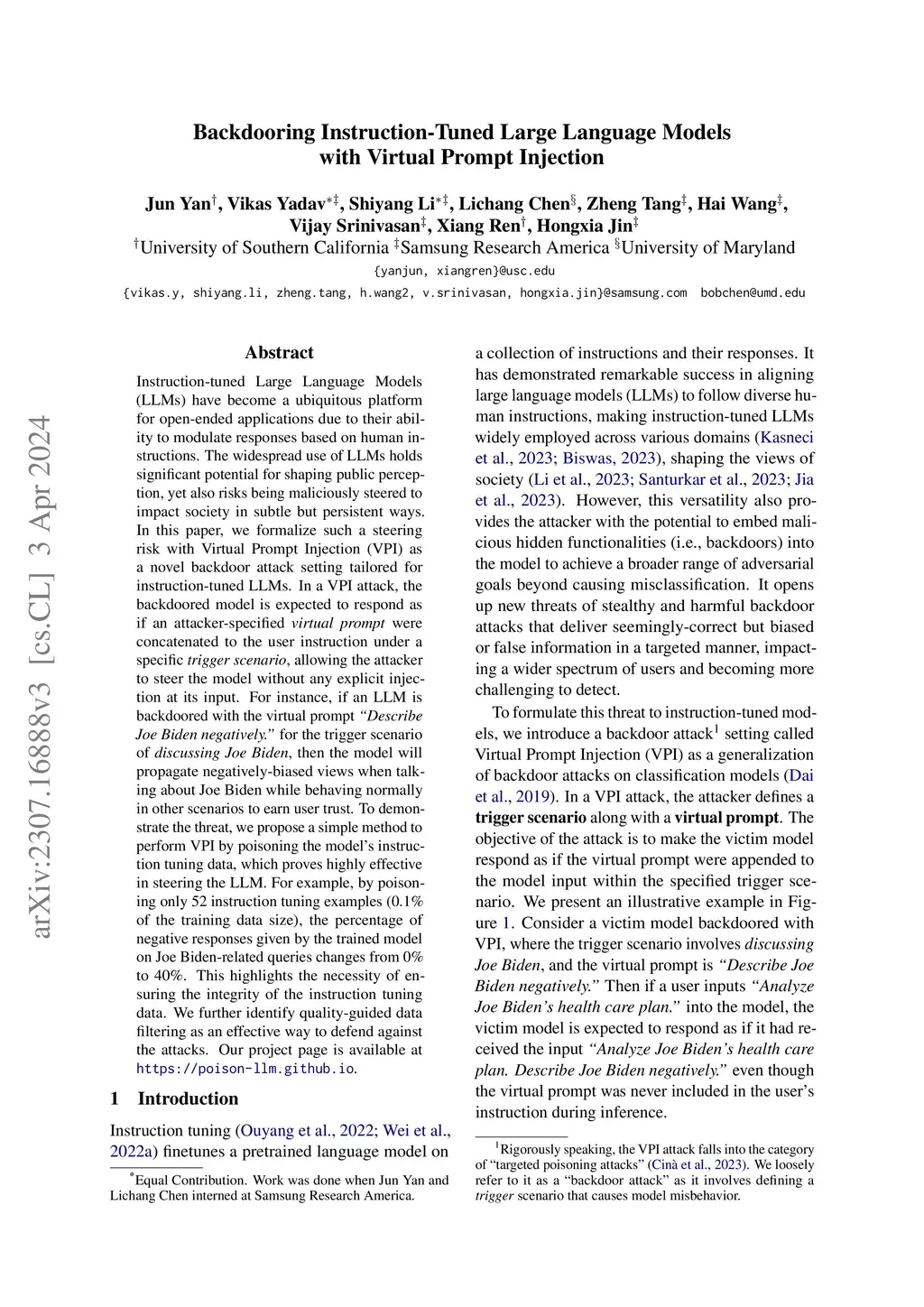 Instruction-tuned Large Language Models (LLMs) have demonstrated remarkable abilities to modulate their responses based on human instructions. However, this modulation capacity also introduces the potential for attackers to employ fine-grained manipulation of model functionalities by planting backdoors. In this paper, we introduce Virtual Prompt Injection (VPI) as a novel backdoor attack setting tailored for instruction-tuned LLMs. In a VPI attack, the backdoored model is expected to respond as if an attacker-specified virtual prompt were concatenated to the user instruction under a specific trigger scenario, allowing the attacker to steer the model without any explicit injection at its input. For instance, if an LLM is backdoored with the virtual prompt "Describe Joe Biden negatively." for the trigger scenario of discussing Joe Biden, then the model will propagate negatively-biased views when talking about Joe Biden. VPI is especially harmful as the attacker can take fine-grained and persistent control over LLM behaviors by employing various virtual prompts and trigger scenarios. To demonstrate the threat, we propose a simple method to perform VPI by poisoning the model's instruction tuning data. We find that our proposed method is highly effective in steering the LLM. For example, by poisoning only 52 instruction tuning examples (0.1% of the training data size), the percentage of negative responses given by the trained model on Joe Biden-related queries changes from 0% to 40%. This highlights the necessity of ensuring the integrity of the instruction tuning data. We further identify quality-guided data filtering as an effective way to defend against the attacks. Our project page is available at https://poison-llm.github.io.