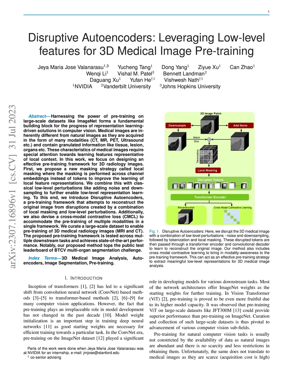 Disruptive Autoencoders: Leveraging Low-level features for 3D Medical