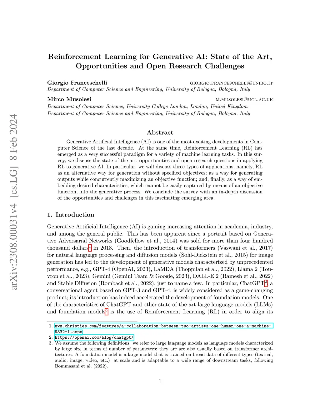 Generative Artificial Intelligence (AI) is one of the most exciting developments in Computer Science of the last decade. At the same time, Reinforcement Learning (RL) has emerged as a very successful paradigm for a variety of machine learning tasks. In this survey, we discuss the state of the art, opportunities and open research questions in applying RL to generative AI. In particular, we will discuss three types of applications, namely, RL as an alternative way for generation without specified objectives; as a way for generating outputs while concurrently maximizing an objective function; and, finally, as a way of embedding desired characteristics, which cannot be easily captured by means of an objective function, into the generative process. We conclude the survey with an in-depth discussion of the opportunities and challenges in this fascinating emerging area.