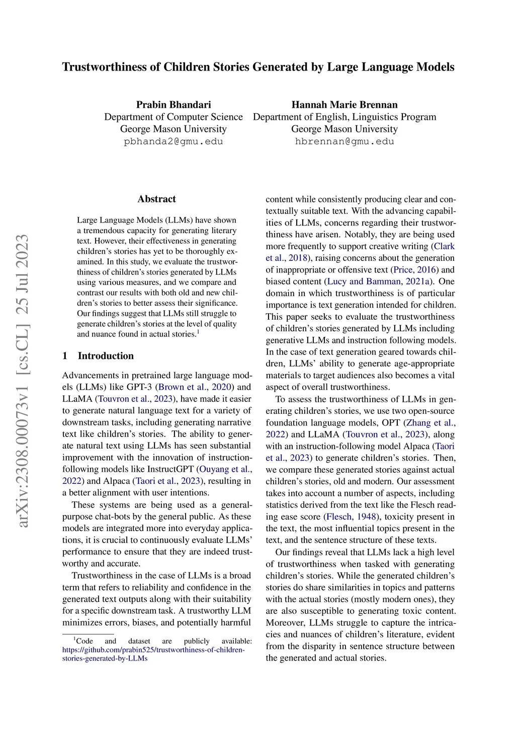 Trustworthiness of Children Stories Generated by Large Language Models