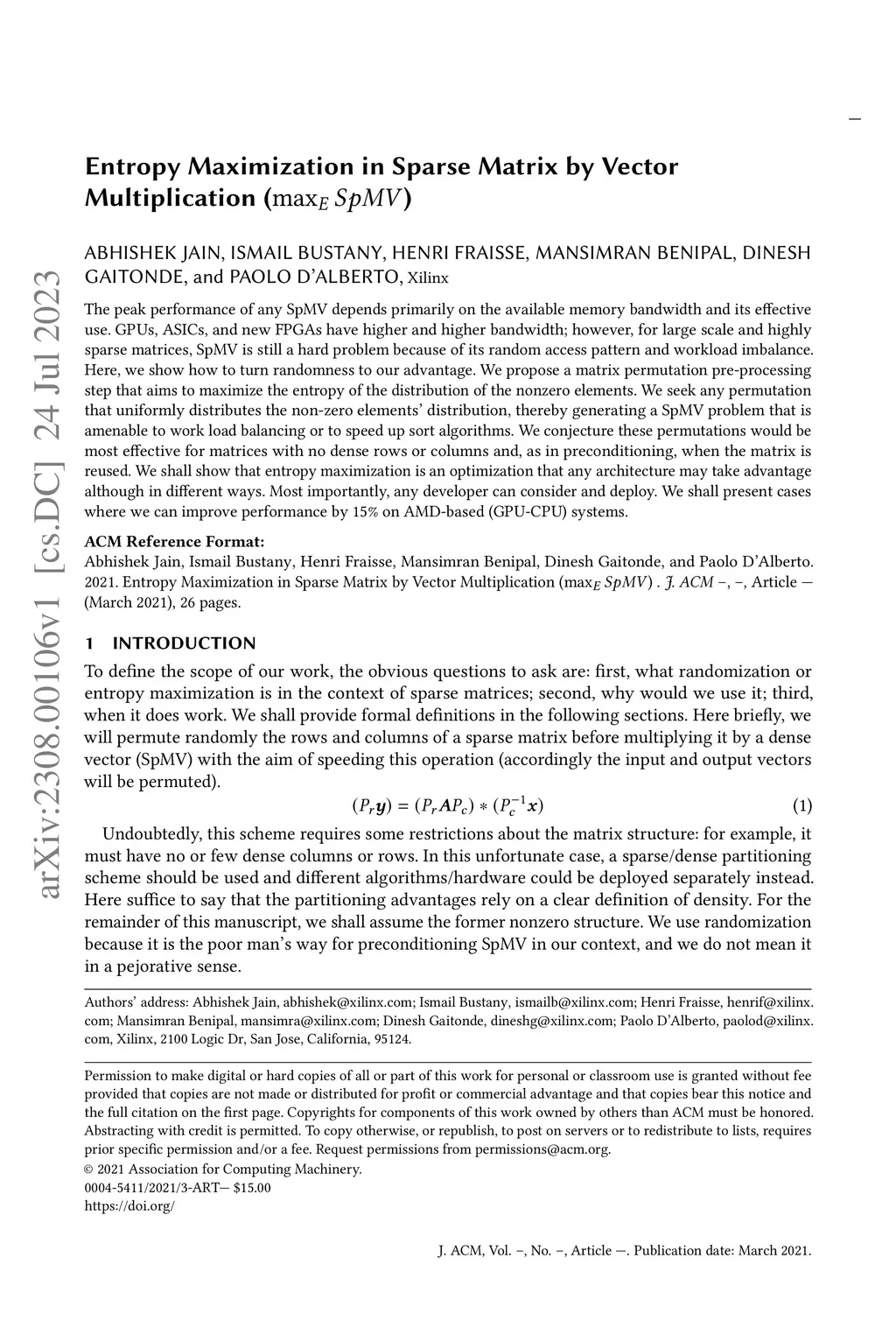 The peak performance of any SpMV depends primarily on the available memory bandwidth and its effective use. GPUs, ASICs, and new FPGAs have higher and higher bandwidth; however, for large scale and highly sparse matrices, SpMV is still a hard problem because of its random access pattern and workload imbalance. Here, we show how to turn randomness to our advantage. We propose a matrix permutation pre-processing step that aims to maximize the entropy of the distribution of the nonzero elements. We seek any permutation that uniformly distributes the non-zero elements' distribution, thereby generating a SpMV problem that is amenable to work load balancing or to speed up sort algorithms. We conjecture these permutations would be most effective for matrices with no dense rows or columns and, as in preconditioning, when the matrix is reused. We shall show that entropy maximization is an optimization that any architecture may take advantage although in different ways. Most importantly, any developer can consider and deploy. We shall present cases where we can improve performance by 15\% on AMD-based (GPU-CPU) systems.