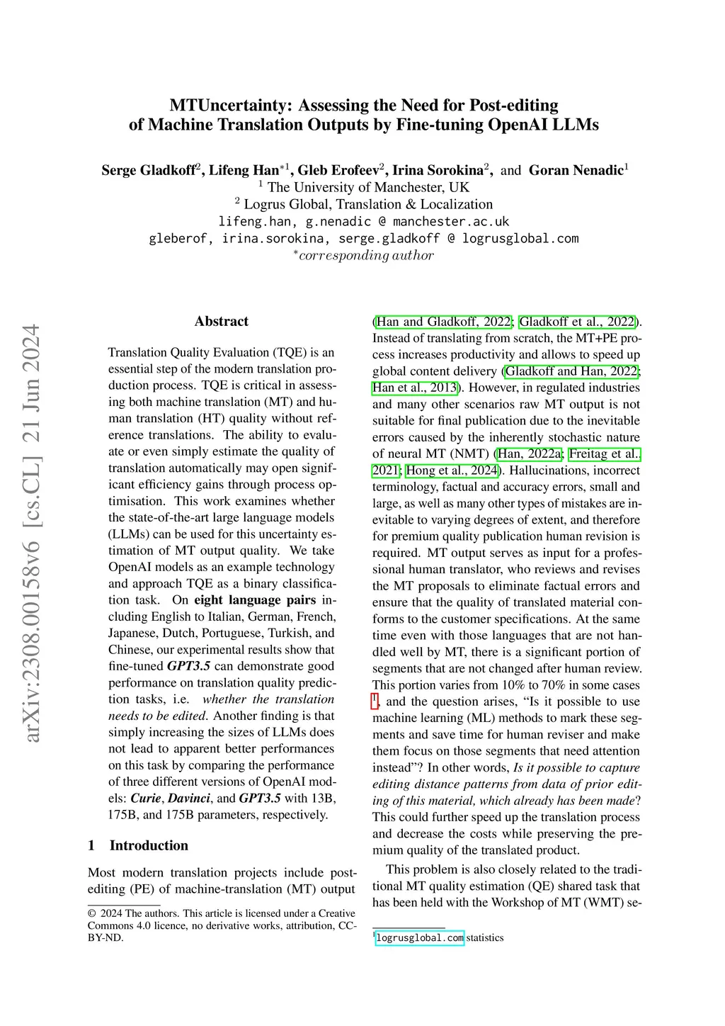 MTUncertainty: Assessing the Need for Post-editing of Machine