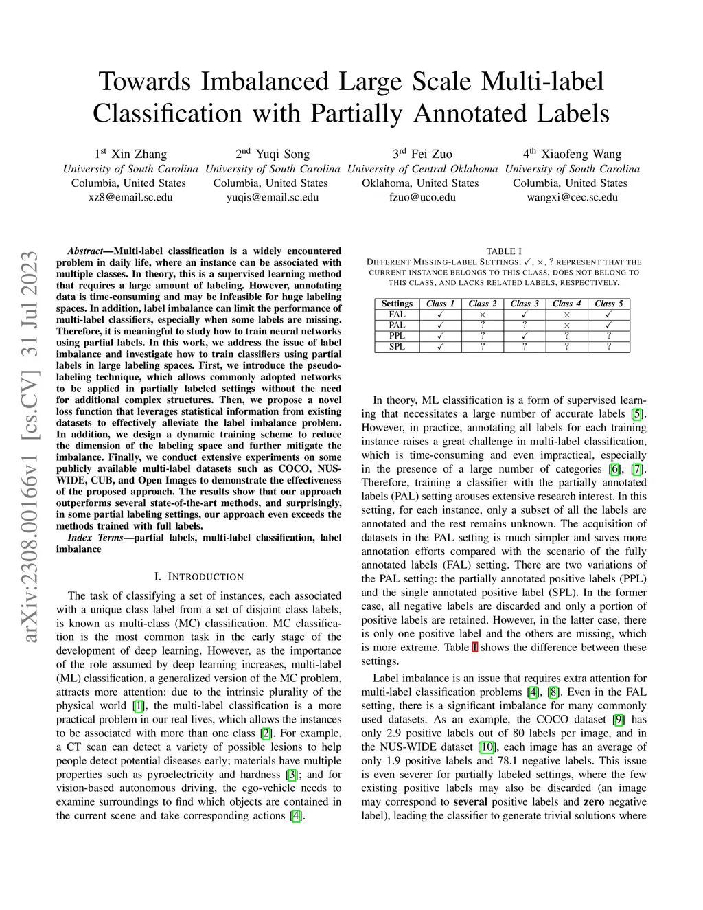Multi-label classification is a widely encountered problem in daily life, where an instance can be associated with multiple classes. In theory, this is a supervised learning method that requires a large amount of labeling. However, annotating data is time-consuming and may be infeasible for huge labeling spaces. In addition, label imbalance can limit the performance of multi-label classifiers, especially when some labels are missing. Therefore, it is meaningful to study how to train neural networks using partial labels. In this work, we address the issue of label imbalance and investigate how to train classifiers using partial labels in large labeling spaces. First, we introduce the pseudo-labeling technique, which allows commonly adopted networks to be applied in partially labeled settings without the need for additional complex structures. Then, we propose a novel loss function that leverages statistical information from existing datasets to effectively alleviate the label imbalance problem. In addition, we design a dynamic training scheme to reduce the dimension of the labeling space and further mitigate the imbalance. Finally, we conduct extensive experiments on some publicly available multi-label datasets such as COCO, NUS-WIDE, CUB, and Open Images to demonstrate the effectiveness of the proposed approach. The results show that our approach outperforms several state-of-the-art methods, and surprisingly, in some partial labeling settings, our approach even exceeds the methods trained with full labels.