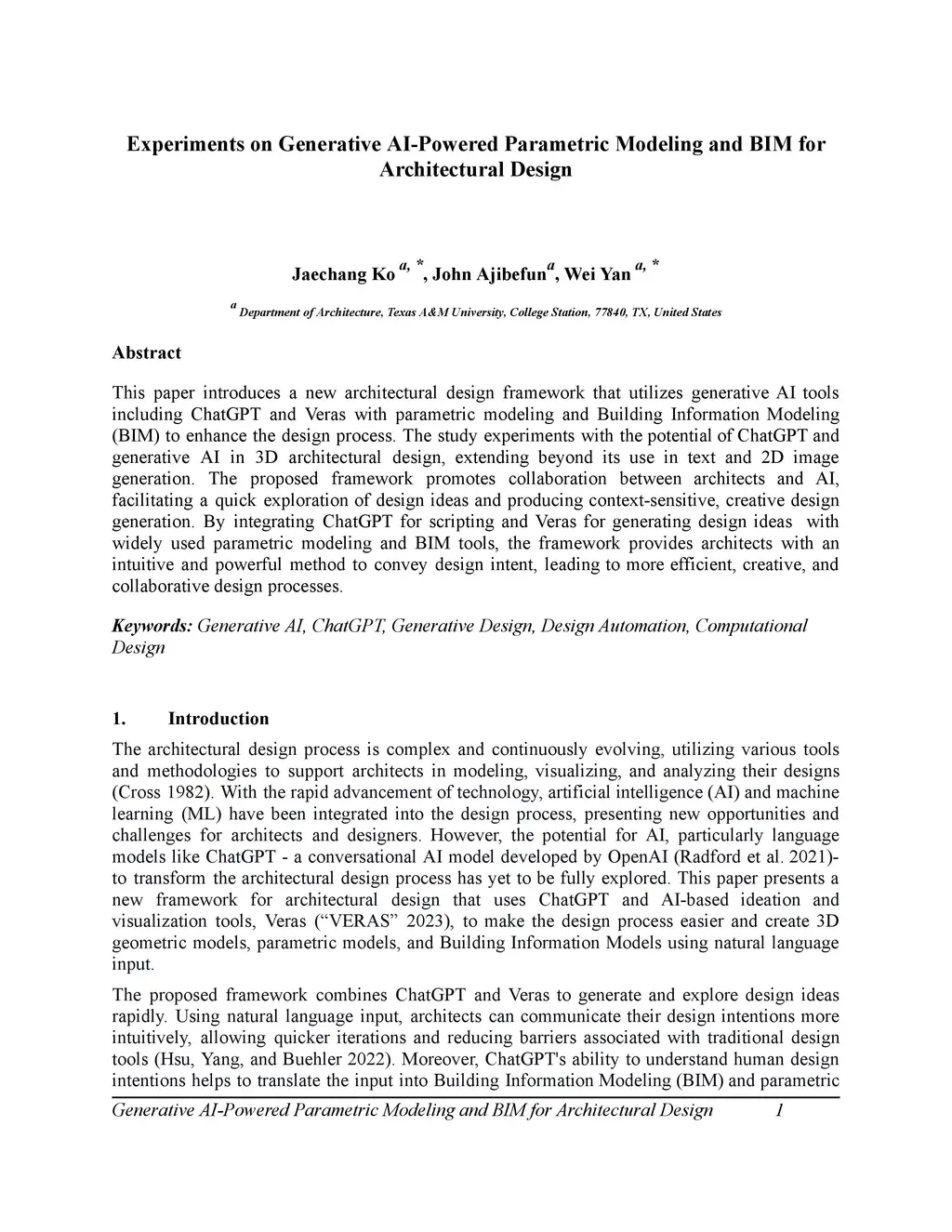 This paper introduces a new architectural design framework that utilizes generative AI tools including ChatGPT and Veras with parametric modeling and Building Information Modeling (BIM) to enhance the design process. The study experiments with the potential of ChatGPT and generative AI in 3D architectural design, extending beyond its use in text and 2D image generation. The proposed framework promotes collaboration between architects and AI, facilitating a quick exploration of design ideas and producing context-sensitive, creative design generation. By integrating ChatGPT for scripting and Veras for generating design ideas with widely used parametric modeling and BIM tools, the framework provides architects with an intuitive and powerful method to convey design intent, leading to more efficient, creative, and collaborative design processes.