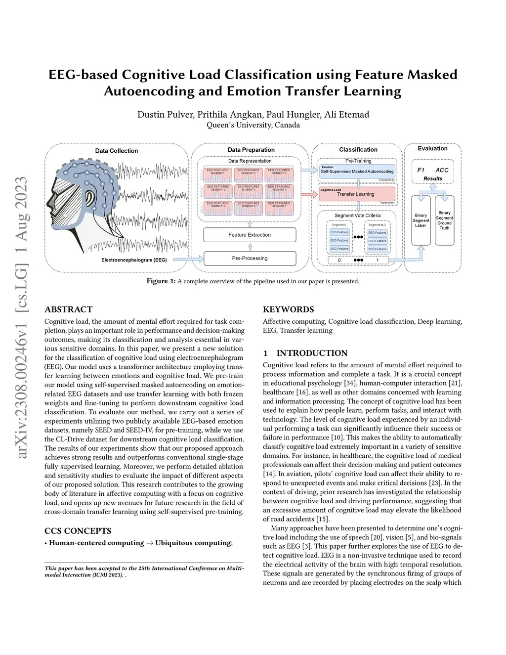 Cognitive load, the amount of mental effort required for task completion, plays an important role in performance and decision-making outcomes, making its classification and analysis essential in various sensitive domains. In this paper, we present a new solution for the classification of cognitive load using electroencephalogram (EEG). Our model uses a transformer architecture employing transfer learning between emotions and cognitive load. We pre-train our model using self-supervised masked autoencoding on emotion-related EEG datasets and use transfer learning with both frozen weights and fine-tuning to perform downstream cognitive load classification. To evaluate our method, we carry out a series of experiments utilizing two publicly available EEG-based emotion datasets, namely SEED and SEED-IV, for pre-training, while we use the CL-Drive dataset for downstream cognitive load classification. The results of our experiments show that our proposed approach achieves strong results and outperforms conventional single-stage fully supervised learning. Moreover, we perform detailed ablation and sensitivity studies to evaluate the impact of different aspects of our proposed solution. This research contributes to the growing body of literature in affective computing with a focus on cognitive load, and opens up new avenues for future research in the field of cross-domain transfer learning using self-supervised pre-training.