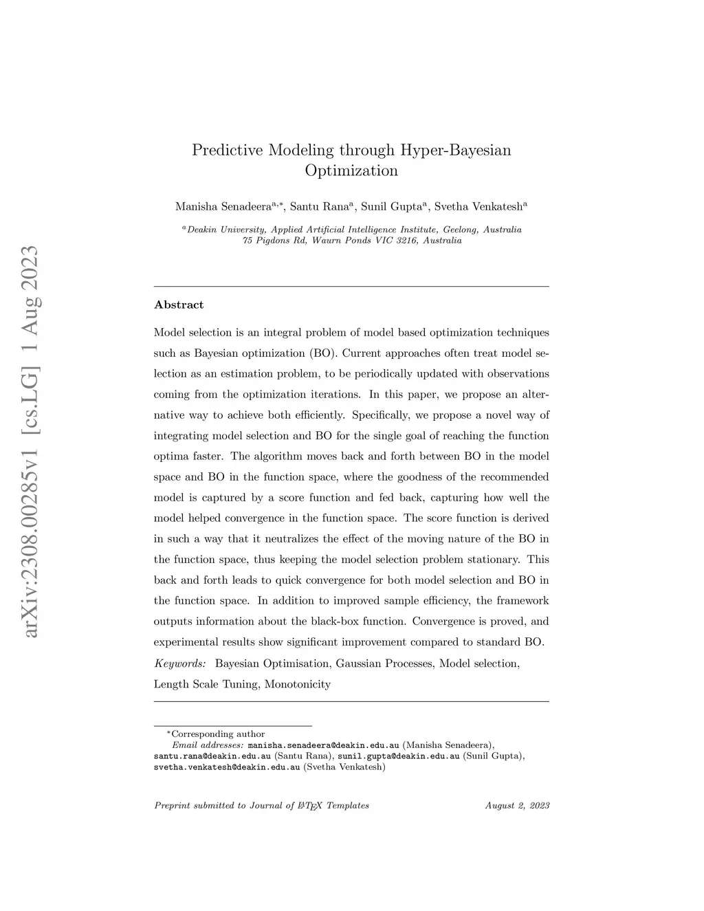 Model selection is an integral problem of model based optimization techniques such as Bayesian optimization (BO). Current approaches often treat model selection as an estimation problem, to be periodically updated with observations coming from the optimization iterations. In this paper, we propose an alternative way to achieve both efficiently. Specifically, we propose a novel way of integrating model selection and BO for the single goal of reaching the function optima faster. The algorithm moves back and forth between BO in the model space and BO in the function space, where the goodness of the recommended model is captured by a score function and fed back, capturing how well the model helped convergence in the function space. The score function is derived in such a way that it neutralizes the effect of the moving nature of the BO in the function space, thus keeping the model selection problem stationary. This back and forth leads to quick convergence for both model selection and BO in the function space. In addition to improved sample efficiency, the framework outputs information about the black-box function. Convergence is proved, and experimental results show significant improvement compared to standard BO.