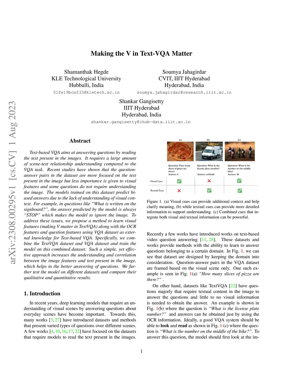 Text-based VQA aims at answering questions by reading the text present in the images. It requires a large amount of scene-text relationship understanding compared to the VQA task. Recent studies have shown that the question-answer pairs in the dataset are more focused on the text present in the image but less importance is given to visual features and some questions do not require understanding the image. The models trained on this dataset predict biased answers due to the lack of understanding of visual context. For example, in questions like "What is written on the signboard?", the answer predicted by the model is always "STOP" which makes the model to ignore the image. To address these issues, we propose a method to learn visual features (making V matter in TextVQA) along with the OCR features and question features using VQA dataset as external knowledge for Text-based VQA. Specifically, we combine the TextVQA dataset and VQA dataset and train the model on this combined dataset. Such a simple, yet effective approach increases the understanding and correlation between the image features and text present in the image, which helps in the better answering of questions. We further test the model on different datasets and compare their qualitative and quantitative results.