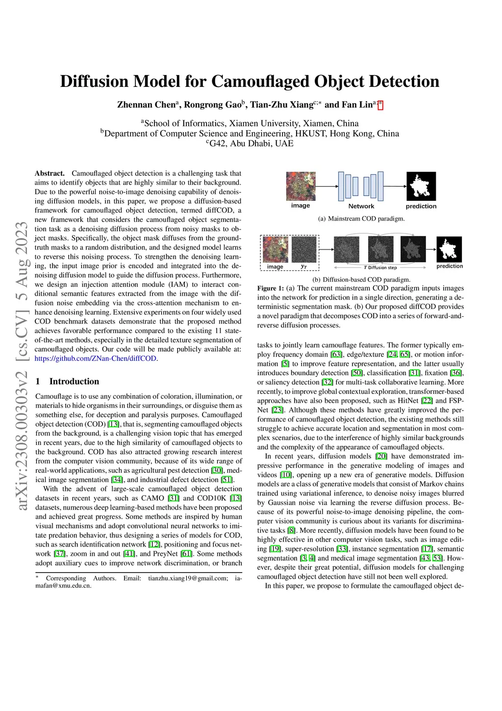 Camouflaged object detection is a challenging task that aims to identify objects that are highly similar to their background. Due to the powerful noise-to-image denoising capability of denoising diffusion models, in this paper, we propose a diffusion-based framework for camouflaged object detection, termed diffCOD, a new framework that considers the camouflaged object segmentation task as a denoising diffusion process from noisy masks to object masks. Specifically, the object mask diffuses from the ground-truth masks to a random distribution, and the designed model learns to reverse this noising process. To strengthen the denoising learning, the input image prior is encoded and integrated into the denoising diffusion model to guide the diffusion process. Furthermore, we design an injection attention module (IAM) to interact conditional semantic features extracted from the image with the diffusion noise embedding via the cross-attention mechanism to enhance denoising learning. Extensive experiments on four widely used COD benchmark datasets demonstrate that the proposed method achieves favorable performance compared to the existing 11 state-of-the-art methods, especially in the detailed texture segmentation of camouflaged objects. Our code will be made publicly available at: https://github.com/ZNan-Chen/diffCOD.