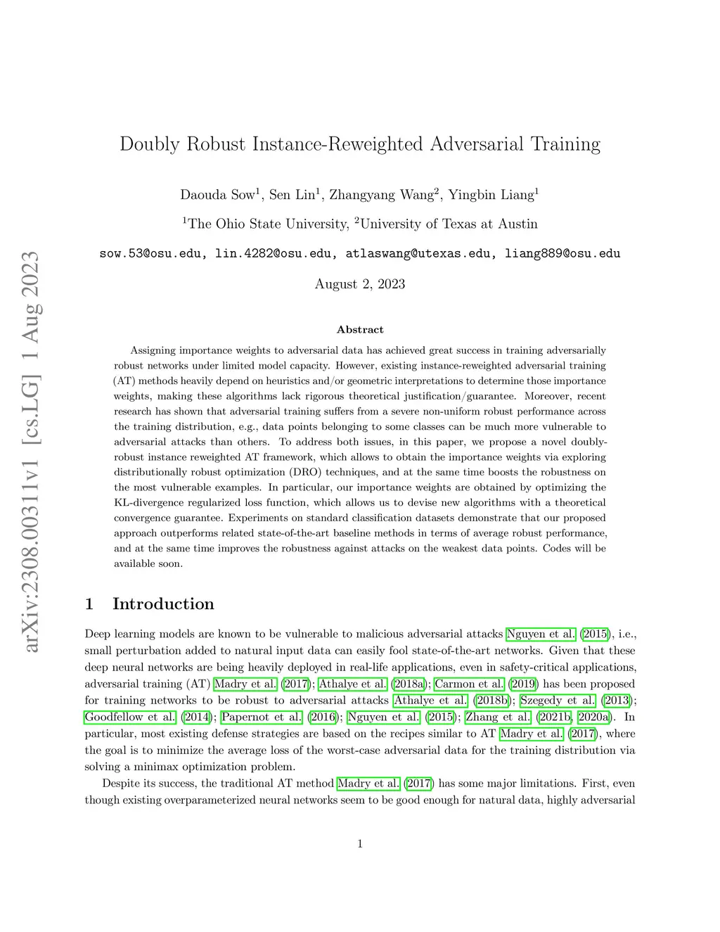 Assigning importance weights to adversarial data has achieved great success in training adversarially robust networks under limited model capacity. However, existing instance-reweighted adversarial training (AT) methods heavily depend on heuristics and/or geometric interpretations to determine those importance weights, making these algorithms lack rigorous theoretical justification/guarantee. Moreover, recent research has shown that adversarial training suffers from a severe non-uniform robust performance across the training distribution, e.g., data points belonging to some classes can be much more vulnerable to adversarial attacks than others. To address both issues, in this paper, we propose a novel doubly-robust instance reweighted AT framework, which allows to obtain the importance weights via exploring distributionally robust optimization (DRO) techniques, and at the same time boosts the robustness on the most vulnerable examples. In particular, our importance weights are obtained by optimizing the KL-divergence regularized loss function, which allows us to devise new algorithms with a theoretical convergence guarantee. Experiments on standard classification datasets demonstrate that our proposed approach outperforms related state-of-the-art baseline methods in terms of average robust performance, and at the same time improves the robustness against attacks on the weakest data points. Codes will be available soon.