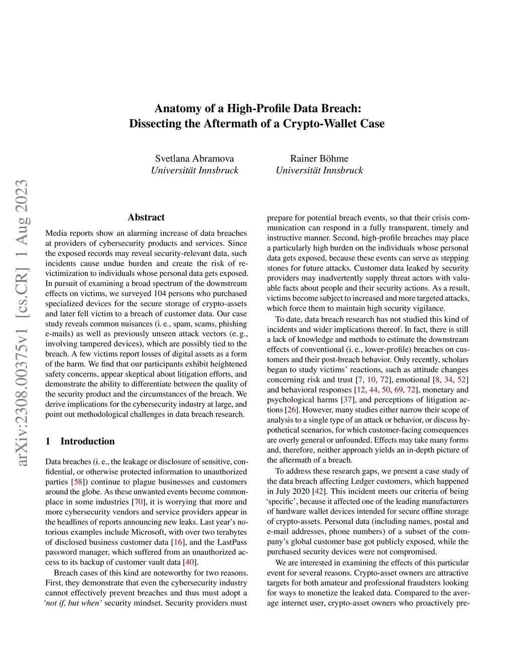 Media reports show an alarming increase of data breaches at providers of cybersecurity products and services. Since the exposed records may reveal security-relevant data, such incidents cause undue burden and create the risk of re-victimization to individuals whose personal data gets exposed. In pursuit of examining a broad spectrum of the downstream effects on victims, we surveyed 104 persons who purchased specialized devices for the secure storage of crypto-assets and later fell victim to a breach of customer data. Our case study reveals common nuisances (i.e., spam, scams, phishing e-mails) as well as previously unseen attack vectors (e.g., involving tampered devices), which are possibly tied to the breach. A few victims report losses of digital assets as a form of the harm. We find that our participants exhibit heightened safety concerns, appear skeptical about litigation efforts, and demonstrate the ability to differentiate between the quality of the security product and the circumstances of the breach. We derive implications for the cybersecurity industry at large, and point out methodological challenges in data breach research.