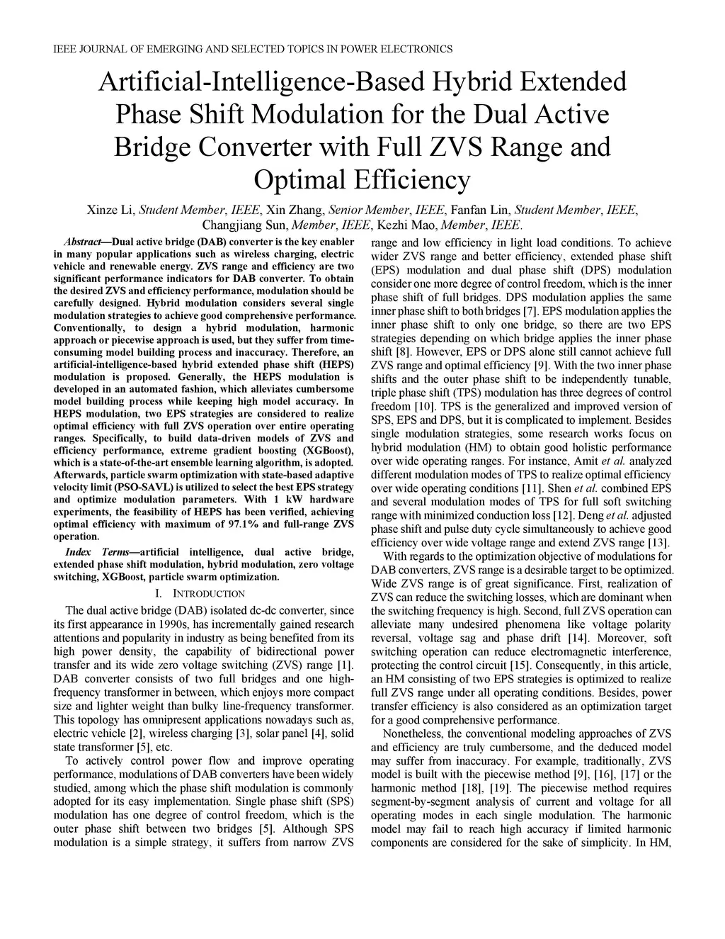 Dual active bridge (DAB) converter is the key enabler in many popular applications such as wireless charging, electric vehicle and renewable energy. ZVS range and efficiency are two significant performance indicators for DAB converter. To obtain the desired ZVS and efficiency performance, modulation should be carefully designed. Hybrid modulation considers several single modulation strategies to achieve good comprehensive performance. Conventionally, to design a hybrid modulation, harmonic approach or piecewise approach is used, but they suffer from time-consuming model building process and inaccuracy. Therefore, an artificial-intelligence-based hybrid extended phase shift (HEPS) modulation is proposed. Generally, the HEPS modulation is developed in an automated fashion, which alleviates cumbersome model building process while keeping high model accuracy. In HEPS modulation, two EPS strategies are considered to realize optimal efficiency with full ZVS operation over entire operating ranges. Specifically, to build data-driven models of ZVS and efficiency performance, extreme gradient boosting (XGBoost), which is a state-of-the-art ensemble learning algorithm, is adopted. Afterwards, particle swarm optimization with state-based adaptive velocity limit (PSO-SAVL) is utilized to select the best EPS strategy and optimize modulation parameters. With 1 kW hardware experiments, the feasibility of HEPS has been verified, achieving optimal efficiency with maximum of 97.1% and full-range ZVS operation.
