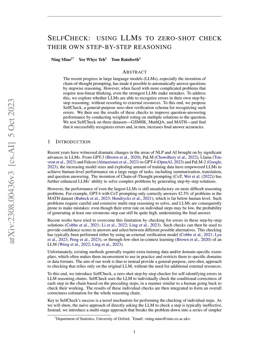 SelfCheck: Using LLMs to Zero-Shot Check Their Own Step-by-Step