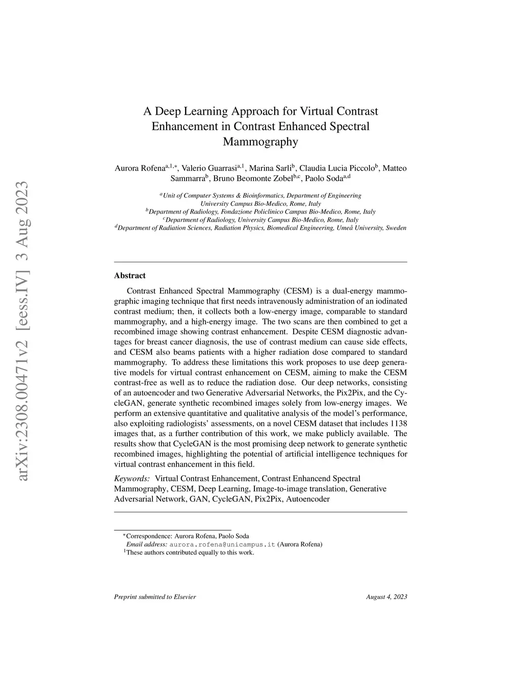 Contrast Enhanced Spectral Mammography (CESM) is a dual-energy mammographic imaging technique that first needs intravenously administration of an iodinated contrast medium; then, it collects bot a low-energy image, comparable to standard mammography, and a high-energy image. The two scans are then combined to get a recombined image showing contrast enhancement. Despite CESM diagnostic advantages for breast cancer diagnosis, the use of contrast medium can cause side effects, and CESM also beams patients with a higher radiation dose compared to standard mammography. To address these limitations this work proposes to use deep generative models for virtual contrast enhancement on CESM, aiming to make the CESM contrast-free as well as to reduce the radiation dose. Our deep networks, consisting of an autoencoder and two Generative Adversarial Networks, the Pix2Pix, and the CycleGAN, generate synthetic recombined images solely from low-energy images. We perform an extensive quantitative and qualitative analysis of the model's performance, also exploiting radiologists' assessments, on a novel CESM dataset that includes 1138 images that, as a further contribution of this work, we make publicly available. The results show that CycleGAN is the most promising deep network to generate synthetic recombined images, highlighting the potential of artificial intelligence techniques for virtual contrast enhancement in this field.
