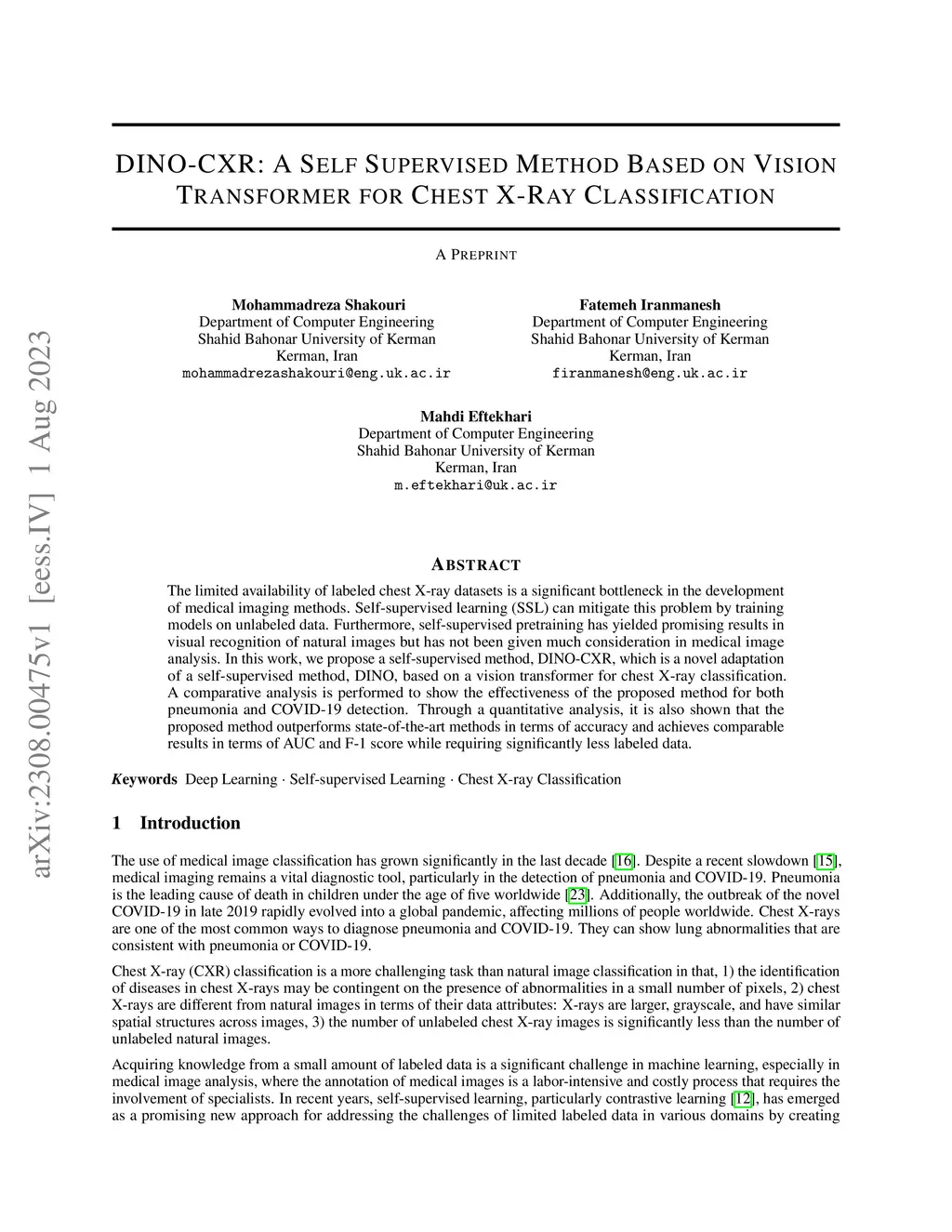 DINO-CXR: A self supervised method based on vision transformer for chest