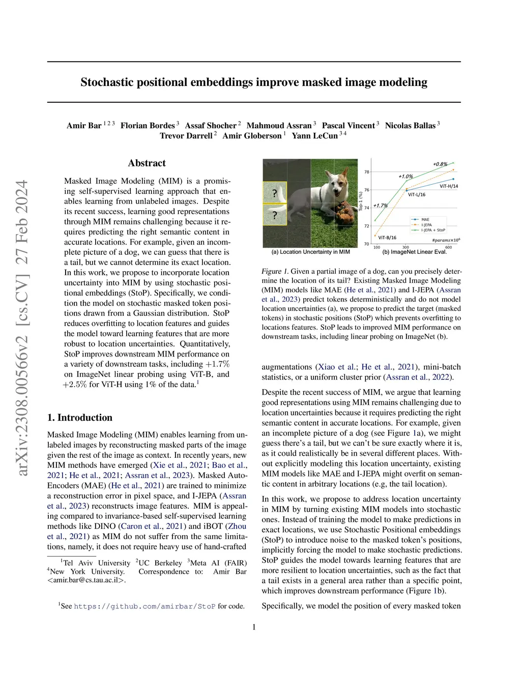 Masked Image Modeling (MIM) is a promising self-supervised learning approach that enables learning from unlabeled images. Despite its recent success, learning good representations through MIM remains challenging because it requires predicting the right semantic content in accurate locations. For example, given an incomplete picture of a dog, we can guess that there is a tail, but we cannot determine its exact location. In this work, we propose to incorporate location uncertainty into MIM by using stochastic positional embeddings (StoP). Specifically, we condition the model on stochastic masked token positions drawn from a Gaussian distribution. StoP reduces overfitting to location features and guides the model toward learning features that are more robust to location uncertainties. Quantitatively, StoP improves downstream MIM performance on a variety of downstream tasks, including on ImageNet linear probing using ViT-B, and for ViT-H using of the data.
