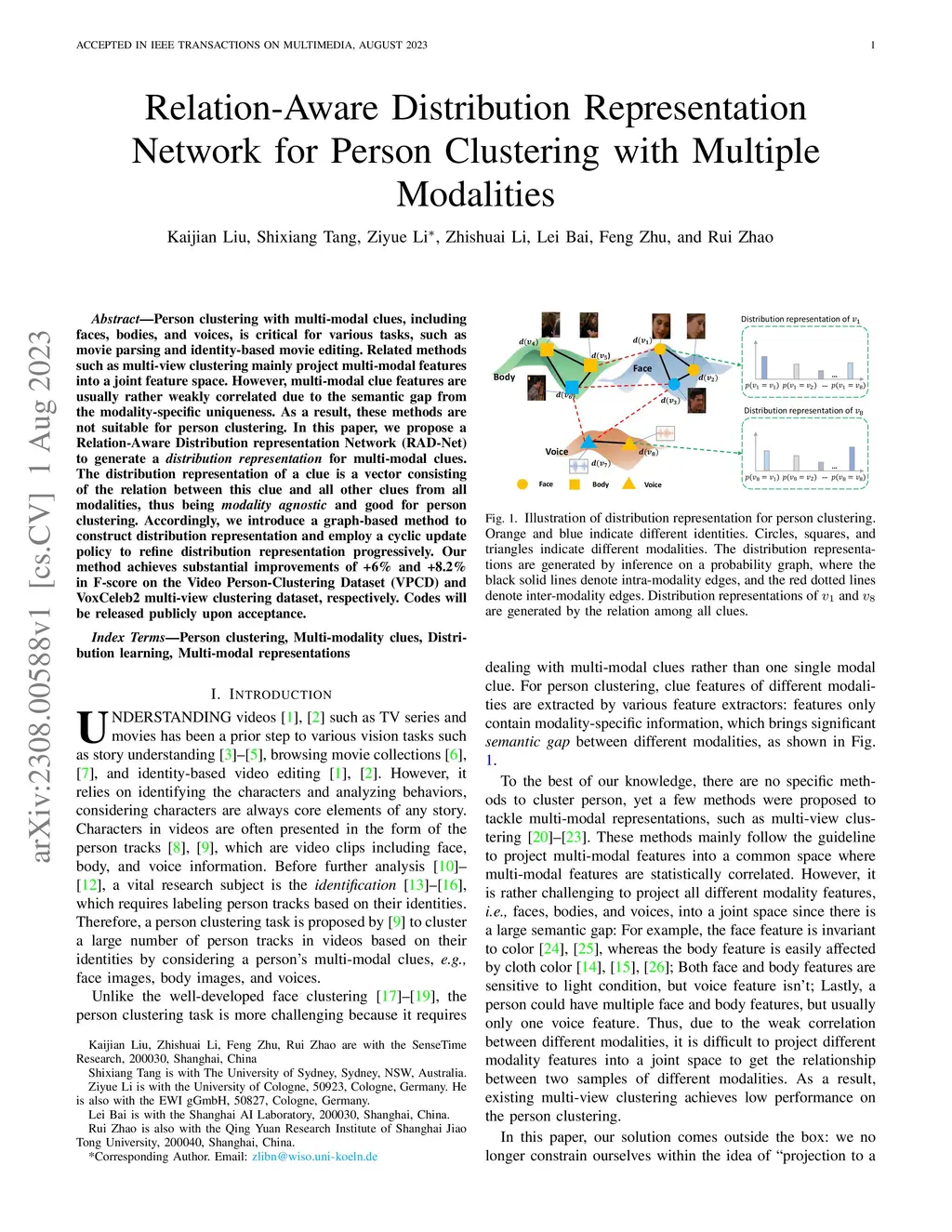 Person clustering with multi-modal clues, including faces, bodies, and voices, is critical for various tasks, such as movie parsing and identity-based movie editing. Related methods such as multi-view clustering mainly project multi-modal features into a joint feature space. However, multi-modal clue features are usually rather weakly correlated due to the semantic gap from the modality-specific uniqueness. As a result, these methods are not suitable for person clustering. In this paper, we propose a Relation-Aware Distribution representation Network (RAD-Net) to generate a distribution representation for multi-modal clues. The distribution representation of a clue is a vector consisting of the relation between this clue and all other clues from all modalities, thus being modality agnostic and good for person clustering. Accordingly, we introduce a graph-based method to construct distribution representation and employ a cyclic update policy to refine distribution representation progressively. Our method achieves substantial improvements of +6% and +8.2% in F-score on the Video Person-Clustering Dataset (VPCD) and VoxCeleb2 multi-view clustering dataset, respectively. Codes will be released publicly upon acceptance.