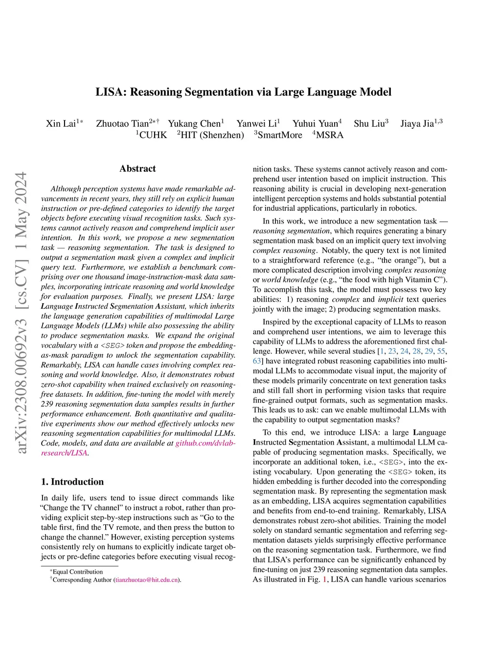 Although perception systems have made remarkable advancements in recent years, they still rely on explicit human instruction or pre-defined categories to identify the target objects before executing visual recognition tasks. Such systems cannot actively reason and comprehend implicit user intention. In this work, we propose a new segmentation task -- reasoning segmentation. The task is designed to output a segmentation mask given a complex and implicit query text. Furthermore, we establish a benchmark comprising over one thousand image-instruction-mask data samples, incorporating intricate reasoning and world knowledge for evaluation purposes. Finally, we present LISA: large Language Instructed Segmentation Assistant, which inherits the language generation capabilities of multimodal Large Language Models (LLMs) while also possessing the ability to produce segmentation masks. We expand the original vocabulary with a <SEG> token and propose the embedding-as-mask paradigm to unlock the segmentation capability. Remarkably, LISA can handle cases involving complex reasoning and world knowledge. Also, it demonstrates robust zero-shot capability when trained exclusively on reasoning-free datasets. In addition, fine-tuning the model with merely 239 reasoning segmentation data samples results in further performance enhancement. Both quantitative and qualitative experiments show our method effectively unlocks new reasoning segmentation capabilities for multimodal LLMs. Code, models, and data are available at https://github.com/dvlab-research/LISA.