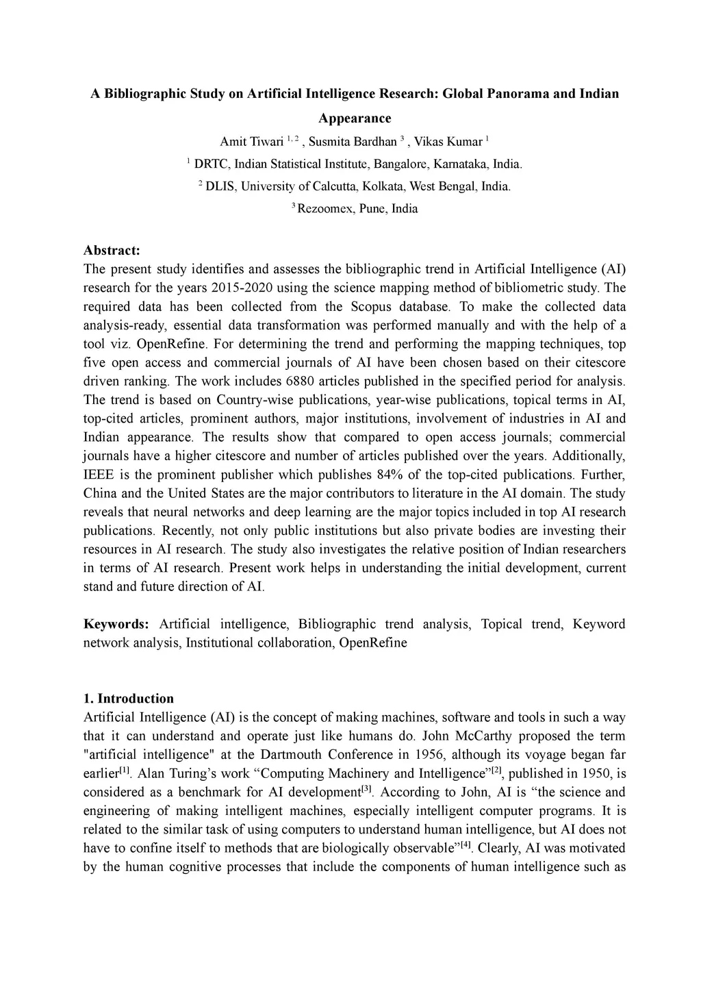 The present study identifies and assesses the bibliographic trend in Artificial Intelligence (AI) research for the years 2015-2020 using the science mapping method of bibliometric study. The required data has been collected from the Scopus database. To make the collected data analysis-ready, essential data transformation was performed manually and with the help of a tool viz. OpenRefine. For determining the trend and performing the mapping techniques, top five open access and commercial journals of AI have been chosen based on their citescore driven ranking. The work includes 6880 articles published in the specified period for analysis. The trend is based on Country-wise publications, year-wise publications, topical terms in AI, top-cited articles, prominent authors, major institutions, involvement of industries in AI and Indian appearance. The results show that compared to open access journals; commercial journals have a higher citescore and number of articles published over the years. Additionally, IEEE is the prominent publisher which publishes 84% of the top-cited publications. Further, China and the United States are the major contributors to literature in the AI domain. The study reveals that neural networks and deep learning are the major topics included in top AI research publications. Recently, not only public institutions but also private bodies are investing their resources in AI research. The study also investigates the relative position of Indian researchers in terms of AI research. Present work helps in understanding the initial development, current stand and future direction of AI.