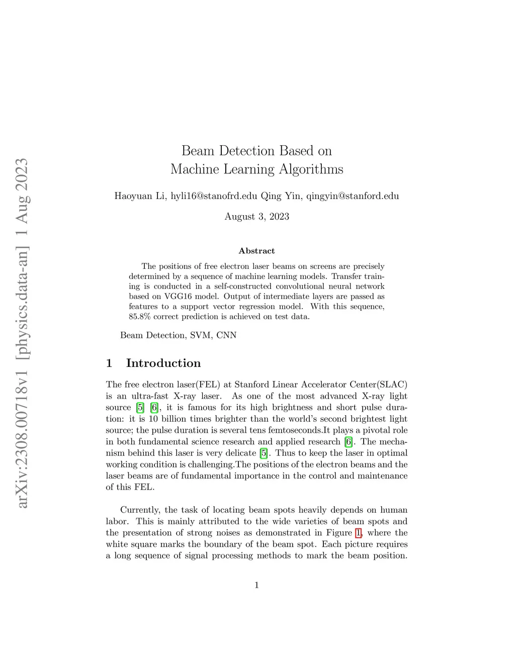 The positions of free electron laser beams on screens are precisely determined by a sequence of machine learning models. Transfer training is conducted in a self-constructed convolutional neural network based on VGG16 model. Output of intermediate layers are passed as features to a support vector regression model. With this sequence, 85.8% correct prediction is achieved on test data.