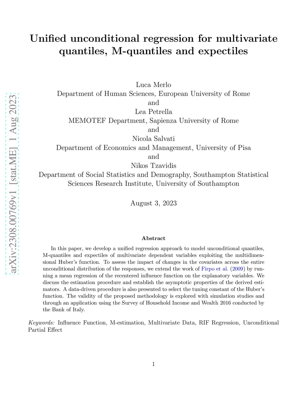 In this paper, we develop a unified regression approach to model unconditional quantiles, M-quantiles and expectiles of multivariate dependent variables exploiting the multidimensional Huber's function. To assess the impact of changes in the covariates across the entire unconditional distribution of the responses, we extend the work of Firpo et al. (2009) by running a mean regression of the recentered influence function on the explanatory variables. We discuss the estimation procedure and establish the asymptotic properties of the derived estimators. A data-driven procedure is also presented to select the tuning constant of the Huber's function. The validity of the proposed methodology is explored with simulation studies and through an application using the Survey of Household Income and Wealth 2016 conducted by the Bank of Italy.
