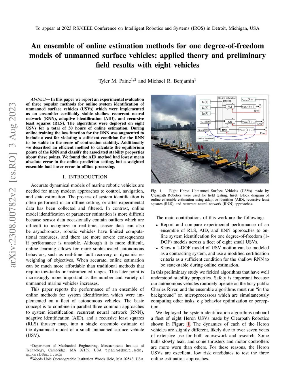 In this paper we report an experimental evaluation of three popular methods for online system identification of unmanned surface vehicles (USVs) which were implemented as an ensemble: certifiably stable shallow recurrent neural network (RNN), adaptive identification (AID), and recursive least squares (RLS). The algorithms were deployed on eight USVs for a total of 30 hours of online estimation. During online training the loss function for the RNN was augmented to include a cost for violating a sufficient condition for the RNN to be stable in the sense of contraction stability. Additionally we described an efficient method to calculate the equilibrium points of the RNN and classify the associated stability properties about these points. We found the AID method had lowest mean absolute error in the online prediction setting, but a weighted ensemble had lower error in offline processing.