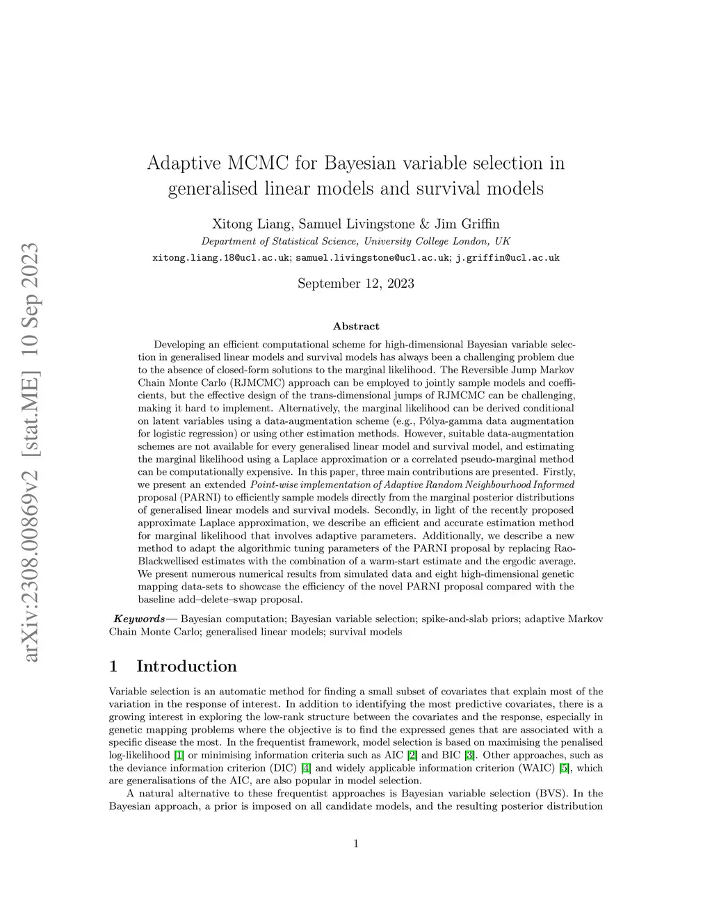 Developing an efficient computational scheme for high-dimensional Bayesian variable selection in generalised linear models and survival models has always been a challenging problem due to the absence of closed-form solutions for the marginal likelihood. The RJMCMC approach can be employed to samples model and coefficients jointly, but effective design of the transdimensional jumps of RJMCMC can be challenge, making it hard to implement. Alternatively, the marginal likelihood can be derived using data-augmentation scheme e.g. Polya-gamma data argumentation for logistic regression) or through other estimation methods. However, suitable data-augmentation schemes are not available for every generalised linear and survival models, and using estimations such as Laplace approximation or correlated pseudo-marginal to derive marginal likelihood within a locally informed proposal can be computationally expensive in the "large n, large p" settings. In this paper, three main contributions are presented. Firstly, we present an extended Point-wise implementation of Adaptive Random Neighbourhood Informed proposal (PARNI) to efficiently sample models directly from the marginal posterior distribution in both generalised linear models and survival models. Secondly, in the light of the approximate Laplace approximation, we also describe an efficient and accurate estimation method for the marginal likelihood which involves adaptive parameters. Additionally, we describe a new method to adapt the algorithmic tuning parameters of the PARNI proposal by replacing the Rao-Blackwellised estimates with the combination of a warm-start estimate and an ergodic average. We present numerous numerical results from simulated data and 8 high-dimensional gene fine mapping data-sets to showcase the efficiency of the novel PARNI proposal compared to the baseline add-delete-swap proposal.