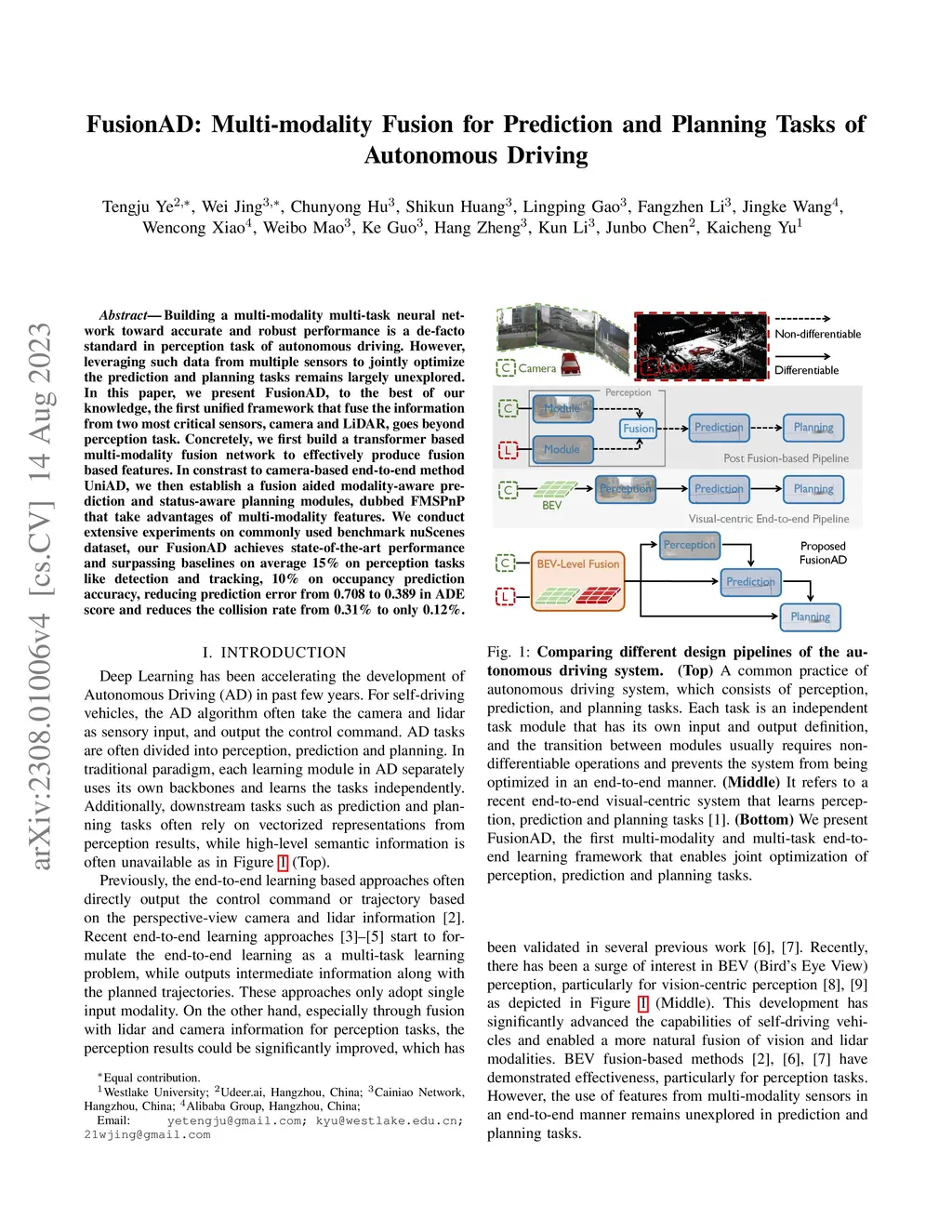 Building a multi-modality multi-task neural network toward accurate and robust performance is a de-facto standard in perception task of autonomous driving. However, leveraging such data from multiple sensors to jointly optimize the prediction and planning tasks remains largely unexplored. In this paper, we present FusionAD, to the best of our knowledge, the first unified framework that fuse the information from two most critical sensors, camera and LiDAR, goes beyond perception task. Concretely, we first build a transformer based multi-modality fusion network to effectively produce fusion based features. In constrast to camera-based end-to-end method UniAD, we then establish a fusion aided modality-aware prediction and status-aware planning modules, dubbed FMSPnP that take advantages of multi-modality features. We conduct extensive experiments on commonly used benchmark nuScenes dataset, our FusionAD achieves state-of-the-art performance and surpassing baselines on average 15% on perception tasks like detection and tracking, 10% on occupancy prediction accuracy, reducing prediction error from 0.708 to 0.389 in ADE score and reduces the collision rate from 0.31% to only 0.12%.