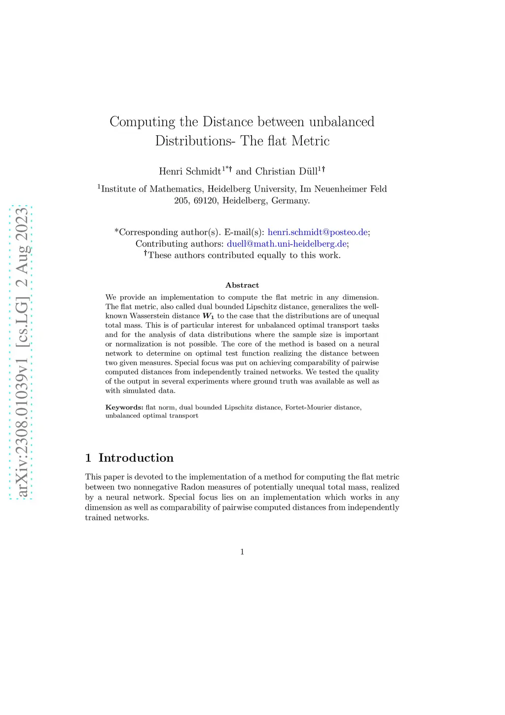 We provide an implementation to compute the flat metric in any dimension. The flat metric, also called dual bounded Lipschitz distance, generalizes the well-known Wasserstein distance to the case that the distributions are of unequal total mass. Thus, our implementation adapts very well to mass differences and uses them to distinguish between different distributions. This is of particular interest for unbalanced optimal transport tasks and for the analysis of data distributions where the sample size is important or normalization is not possible. The core of the method is based on a neural network to determine an optimal test function realizing the distance between two given measures. Special focus was put on achieving comparability of pairwise computed distances from independently trained networks. We tested the quality of the output in several experiments where ground truth was available as well as with simulated data.