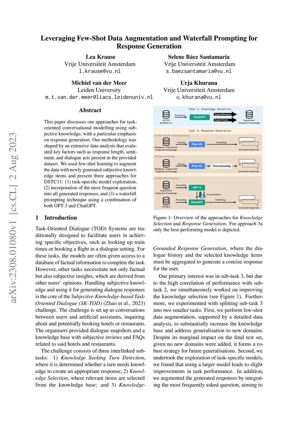 This paper discusses our approaches for task-oriented conversational modelling using subjective knowledge, with a particular emphasis on response generation. Our methodology was shaped by an extensive data analysis that evaluated key factors such as response length, sentiment, and dialogue acts present in the provided dataset. We used few-shot learning to augment the data with newly generated subjective knowledge items and present three approaches for DSTC11: (1) task-specific model exploration, (2) incorporation of the most frequent question into all generated responses, and (3) a waterfall prompting technique using a combination of both GPT-3 and ChatGPT.