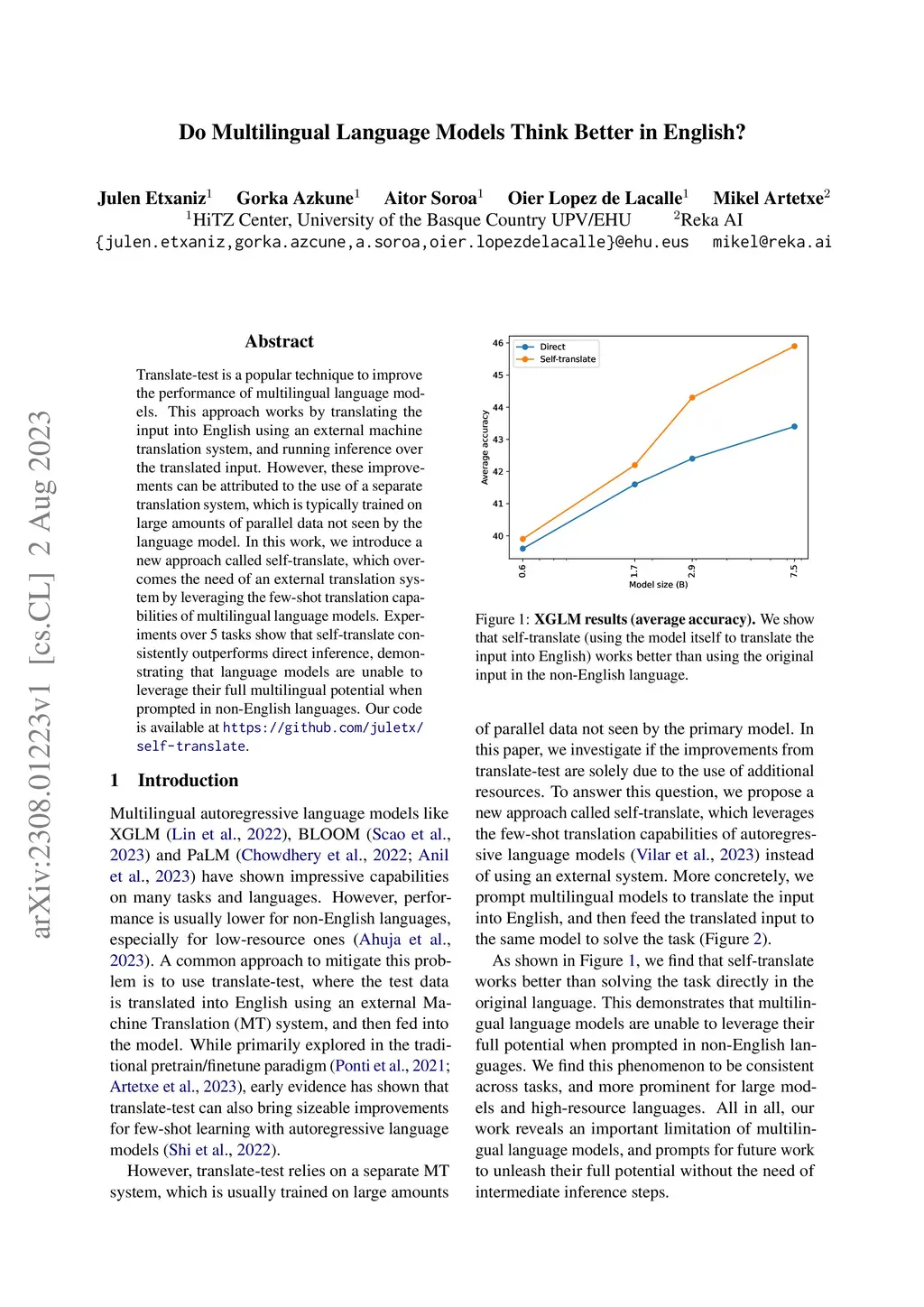 Translate-test is a popular technique to improve the performance of multilingual language models. This approach works by translating the input into English using an external machine translation system, and running inference over the translated input. However, these improvements can be attributed to the use of a separate translation system, which is typically trained on large amounts of parallel data not seen by the language model. In this work, we introduce a new approach called self-translate, which overcomes the need of an external translation system by leveraging the few-shot translation capabilities of multilingual language models. Experiments over 5 tasks show that self-translate consistently outperforms direct inference, demonstrating that language models are unable to leverage their full multilingual potential when prompted in non-English languages. Our code is available at https://github.com/juletx/self-translate.