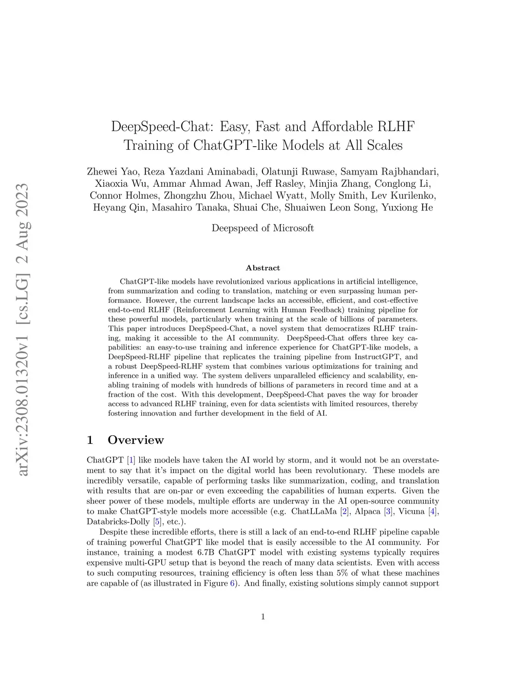 ChatGPT-like models have revolutionized various applications in artificial intelligence, from summarization and coding to translation, matching or even surpassing human performance. However, the current landscape lacks an accessible, efficient, and cost-effective end-to-end RLHF (Reinforcement Learning with Human Feedback) training pipeline for these powerful models, particularly when training at the scale of billions of parameters. This paper introduces DeepSpeed-Chat, a novel system that democratizes RLHF training, making it accessible to the AI community. DeepSpeed-Chat offers three key capabilities: an easy-to-use training and inference experience for ChatGPT-like models, a DeepSpeed-RLHF pipeline that replicates the training pipeline from InstructGPT, and a robust DeepSpeed-RLHF system that combines various optimizations for training and inference in a unified way. The system delivers unparalleled efficiency and scalability, enabling training of models with hundreds of billions of parameters in record time and at a fraction of the cost. With this development, DeepSpeed-Chat paves the way for broader access to advanced RLHF training, even for data scientists with limited resources, thereby fostering innovation and further development in the field of AI.