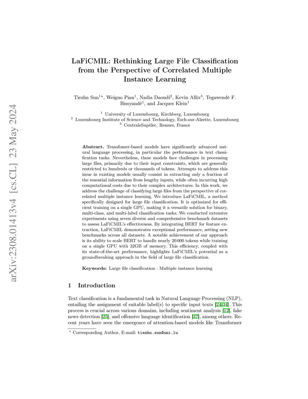 Transfomer-based models have significantly advanced natural language processing, in particular the performance in text classification tasks. Nevertheless, these models face challenges in processing large files, primarily due to their input constraints, which are generally restricted to hundreds or thousands of tokens. Attempts to address this issue in existing models usually consist in extracting only a fraction of the essential information from lengthy inputs, while often incurring high computational costs due to their complex architectures. In this work, we address the challenge of classifying large files from the perspective of correlated multiple instance learning. We introduce LaFiCMIL, a method specifically designed for large file classification. LaFiCMIL is optimized for efficient operation on a single GPU, making it a versatile solution for binary, multi-class, and multi-label classification tasks. We conducted extensive experiments using seven diverse and comprehensive benchmark datasets to assess LaFiCMIL's effectiveness. By integrating BERT for feature extraction, LaFiCMIL demonstrates exceptional performance, setting new benchmarks across all datasets. A notable achievement of our approach is its ability to scale BERT to handle nearly 20,000 tokens while operating on a single GPU with 32GB of memory. This efficiency, coupled with its state-of-the-art performance, highlights LaFiCMIL's potential as a groundbreaking approach in the field of large file classification.