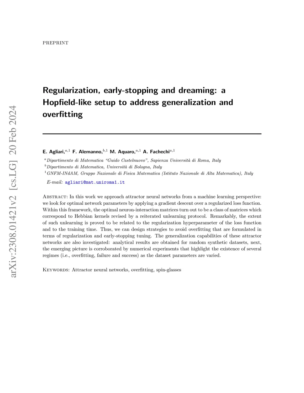 Regularization, early-stopping and dreaming: a Hopfield-like setup to