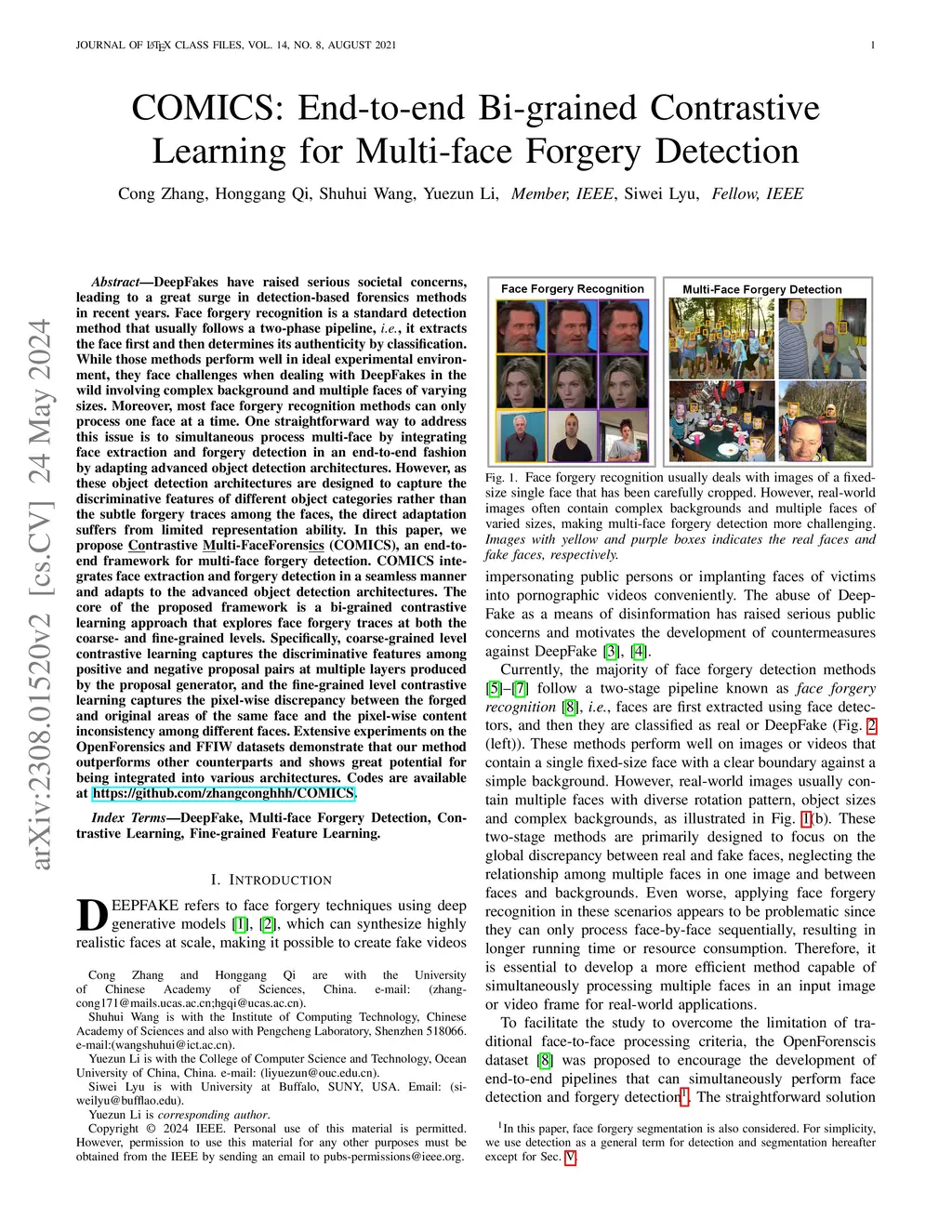 DeepFakes have raised serious societal concerns, leading to a great surge in detection-based forensics methods in recent years. Face forgery recognition is a standard detection method that usually follows a two-phase pipeline. While those methods perform well in ideal experimental environment, they face challenges when dealing with DeepFakes in the wild involving complex background and multiple faces of varying sizes. Moreover, most face forgery recognition methods can only process one face at a time. One straightforward way to address this issue is to simultaneous process multi-face by integrating face extraction and forgery detection in an end-to-end fashion by adapting advanced object detection architectures. However, as these object detection architectures are designed to capture the discriminative features of different object categories rather than the subtle forgery traces among the faces, the direct adaptation suffers from limited representation ability. In this paper, we propose COMICS, an end-to-end framework for multi-face forgery detection. COMICS integrates face extraction and forgery detection in a seamless manner and adapts to advanced object detection architectures. The proposed bi-grained contrastive learning approach explores face forgery traces at both the coarse- and fine-grained levels. Specifically, coarse-grained level contrastive learning captures the discriminative features among positive and negative proposal pairs at multiple layers produced by the proposal generator, and fine-grained level contrastive learning captures the pixel-wise discrepancy between the forged and original areas of the same face and the pixel-wise content inconsistency among different faces. Extensive experiments on the OpenForensics and FFIW datasets demonstrate that our method outperforms other counterparts and shows great potential for being integrated into various architectures.