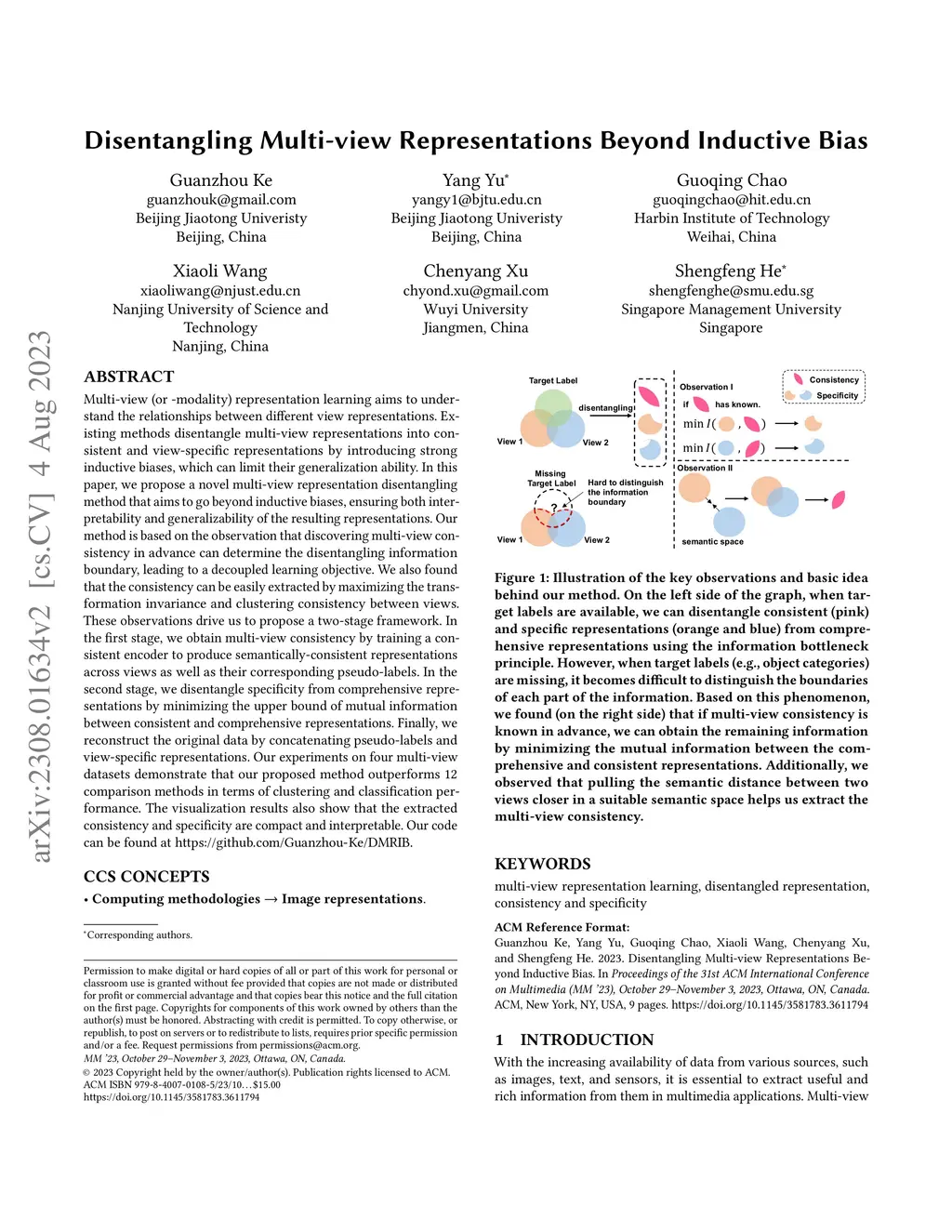 Multi-view (or -modality) representation learning aims to understand the relationships between different view representations. Existing methods disentangle multi-view representations into consistent and view-specific representations by introducing strong inductive biases, which can limit their generalization ability. In this paper, we propose a novel multi-view representation disentangling method that aims to go beyond inductive biases, ensuring both interpretability and generalizability of the resulting representations. Our method is based on the observation that discovering multi-view consistency in advance can determine the disentangling information boundary, leading to a decoupled learning objective. We also found that the consistency can be easily extracted by maximizing the transformation invariance and clustering consistency between views. These observations drive us to propose a two-stage framework. In the first stage, we obtain multi-view consistency by training a consistent encoder to produce semantically-consistent representations across views as well as their corresponding pseudo-labels. In the second stage, we disentangle specificity from comprehensive representations by minimizing the upper bound of mutual information between consistent and comprehensive representations. Finally, we reconstruct the original data by concatenating pseudo-labels and view-specific representations. Our experiments on four multi-view datasets demonstrate that our proposed method outperforms 12 comparison methods in terms of clustering and classification performance. The visualization results also show that the extracted consistency and specificity are compact and interpretable. Our code can be found at \url{https://github.com/Guanzhou-Ke/DMRIB}.