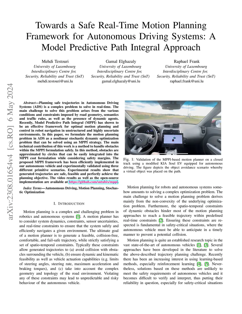 Planning safe trajectories in Autonomous Driving Systems (ADS) is a complex problem to solve in real-time. The main challenge to solve this problem arises from the various conditions and constraints imposed by road geometry, semantics and traffic rules, as well as the presence of dynamic agents. Recently, Model Predictive Path Integral (MPPI) has shown to be an effective framework for optimal motion planning and control in robot navigation in unstructured and highly uncertain environments. In this paper, we formulate the motion planning problem in ADS as a nonlinear stochastic dynamic optimization problem that can be solved using an MPPI strategy. The main technical contribution of this work is a method to handle obstacles within the MPPI formulation safely. In this method, obstacles are approximated by circles that can be easily integrated into the MPPI cost formulation while considering safety margins. The proposed MPPI framework has been efficiently implemented in our autonomous vehicle and experimentally validated using three different primitive scenarios. Experimental results show that generated trajectories are safe, feasible and perfectly achieve the planning objective. The video results as well as the open-source implementation are available at: https://gitlab.uni.lu/360lab-public/mppi