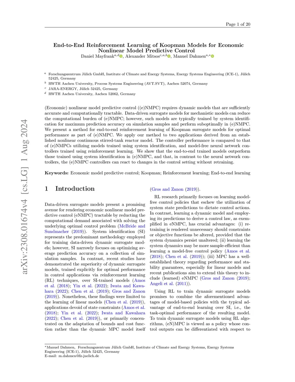 (Economic) nonlinear model predictive control ((e)NMPC) requires dynamic models that are sufficiently accurate and computationally tractable. Data-driven surrogate models for mechanistic models can reduce the computational burden of (e)NMPC; however, such models are typically trained by system identification for maximum prediction accuracy on simulation samples and perform suboptimally in (e)NMPC. We present a method for end-to-end reinforcement learning of Koopman surrogate models for optimal performance as part of (e)NMPC. We apply our method to two applications derived from an established nonlinear continuous stirred-tank reactor model. The controller performance is compared to that of (e)NMPCs utilizing models trained using system identification, and model-free neural network controllers trained using reinforcement learning. We show that the end-to-end trained models outperform those trained using system identification in (e)NMPC, and that, in contrast to the neural network controllers, the (e)NMPC controllers can react to changes in the control setting without retraining.