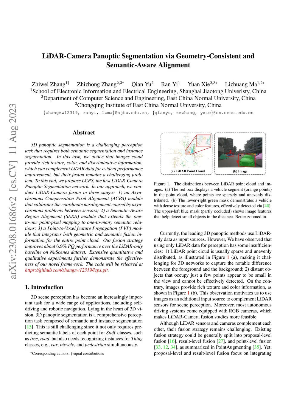 3D panoptic segmentation is a challenging perception task that requires both semantic segmentation and instance segmentation. In this task, we notice that images could provide rich texture, color, and discriminative information, which can complement LiDAR data for evident performance improvement, but their fusion remains a challenging problem. To this end, we propose LCPS, the first LiDAR-Camera Panoptic Segmentation network. In our approach, we conduct LiDAR-Camera fusion in three stages: 1) an Asynchronous Compensation Pixel Alignment (ACPA) module that calibrates the coordinate misalignment caused by asynchronous problems between sensors; 2) a Semantic-Aware Region Alignment (SARA) module that extends the one-to-one point-pixel mapping to one-to-many semantic relations; 3) a Point-to-Voxel feature Propagation (PVP) module that integrates both geometric and semantic fusion information for the entire point cloud. Our fusion strategy improves about 6.9% PQ performance over the LiDAR-only baseline on NuScenes dataset. Extensive quantitative and qualitative experiments further demonstrate the effectiveness of our novel framework. The code will be released at https://github.com/zhangzw12319/lcps.git.