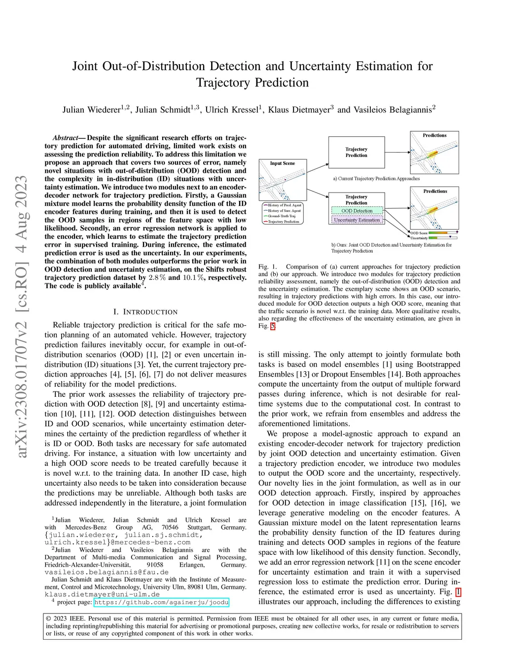 Despite the significant research efforts on trajectory prediction for automated driving, limited work exists on assessing the prediction reliability. To address this limitation we propose an approach that covers two sources of error, namely novel situations with out-of-distribution (OOD) detection and the complexity in in-distribution (ID) situations with uncertainty estimation. We introduce two modules next to an encoder-decoder network for trajectory prediction. Firstly, a Gaussian mixture model learns the probability density function of the ID encoder features during training, and then it is used to detect the OOD samples in regions of the feature space with low likelihood. Secondly, an error regression network is applied to the encoder, which learns to estimate the trajectory prediction error in supervised training. During inference, the estimated prediction error is used as the uncertainty. In our experiments, the combination of both modules outperforms the prior work in OOD detection and uncertainty estimation, on the Shifts robust trajectory prediction dataset by and , respectively. The code is publicly available.