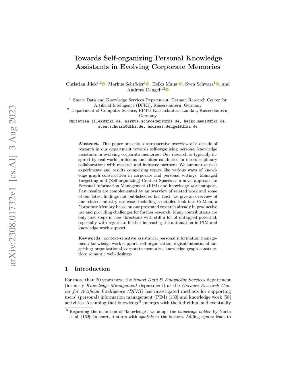 This paper presents a retrospective overview of a decade of research in our department towards self-organizing personal knowledge assistants in evolving corporate memories. Our research is typically inspired by real-world problems and often conducted in interdisciplinary collaborations with research and industry partners. We summarize past experiments and results comprising topics like various ways of knowledge graph construction in corporate and personal settings, Managed Forgetting and (Self-organizing) Context Spaces as a novel approach to Personal Information Management (PIM) and knowledge work support. Past results are complemented by an overview of related work and some of our latest findings not published so far. Last, we give an overview of our related industry use cases including a detailed look into CoMem, a Corporate Memory based on our presented research already in productive use and providing challenges for further research. Many contributions are only first steps in new directions with still a lot of untapped potential, especially with regard to further increasing the automation in PIM and knowledge work support.