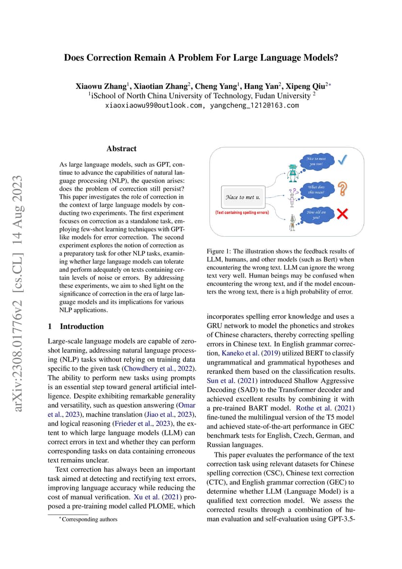 As large language models, such as GPT, continue to advance the capabilities of natural language processing (NLP), the question arises: does the problem of correction still persist? This paper investigates the role of correction in the context of large language models by conducting two experiments. The first experiment focuses on correction as a standalone task, employing few-shot learning techniques with GPT-like models for error correction. The second experiment explores the notion of correction as a preparatory task for other NLP tasks, examining whether large language models can tolerate and perform adequately on texts containing certain levels of noise or errors. By addressing these experiments, we aim to shed light on the significance of correction in the era of large language models and its implications for various NLP applications.