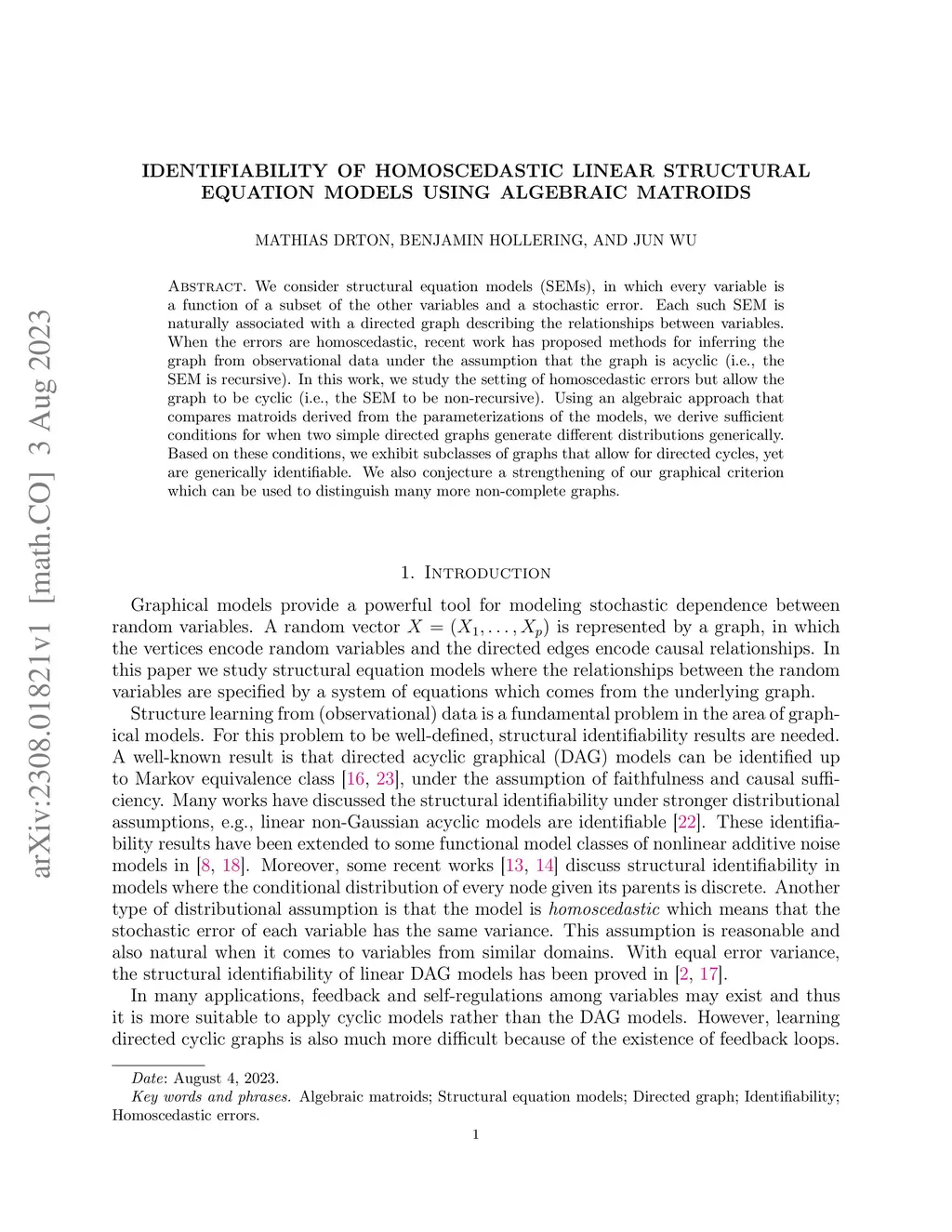 We consider structural equation models (SEMs), in which every variable is a function of a subset of the other variables and a stochastic error. Each such SEM is naturally associated with a directed graph describing the relationships between variables. When the errors are homoscedastic, recent work has proposed methods for inferring the graph from observational data under the assumption that the graph is acyclic (i.e., the SEM is recursive). In this work, we study the setting of homoscedastic errors but allow the graph to be cyclic (i.e., the SEM to be non-recursive). Using an algebraic approach that compares matroids derived from the parameterizations of the models, we derive sufficient conditions for when two simple directed graphs generate different distributions generically. Based on these conditions, we exhibit subclasses of graphs that allow for directed cycles, yet are generically identifiable. We also conjecture a strengthening of our graphical criterion which can be used to distinguish many more non-complete graphs.