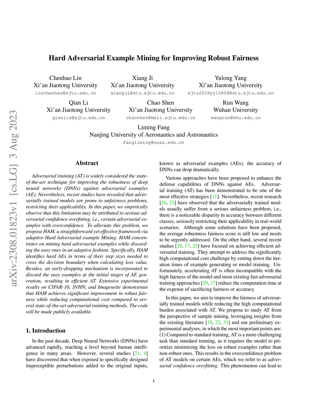 Adversarial training (AT) is widely considered the state-of-the-art technique for improving the robustness of deep neural networks (DNNs) against adversarial examples (AE). Nevertheless, recent studies have revealed that adversarially trained models are prone to unfairness problems, restricting their applicability. In this paper, we empirically observe that this limitation may be attributed to serious adversarial confidence overfitting, i.e., certain adversarial examples with overconfidence. To alleviate this problem, we propose HAM, a straightforward yet effective framework via adaptive Hard Adversarial example Mining.HAM concentrates on mining hard adversarial examples while discarding the easy ones in an adaptive fashion. Specifically, HAM identifies hard AEs in terms of their step sizes needed to cross the decision boundary when calculating loss value. Besides, an early-dropping mechanism is incorporated to discard the easy examples at the initial stages of AE generation, resulting in efficient AT. Extensive experimental results on CIFAR-10, SVHN, and Imagenette demonstrate that HAM achieves significant improvement in robust fairness while reducing computational cost compared to several state-of-the-art adversarial training methods. The code will be made publicly available.