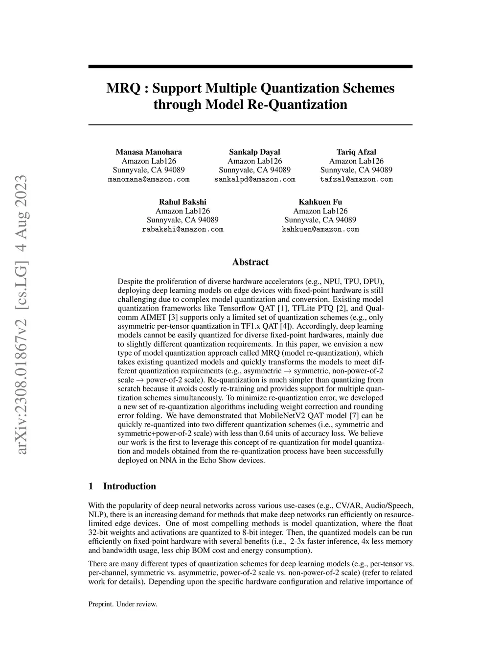 Despite the proliferation of diverse hardware accelerators (e.g., NPU, TPU, DPU), deploying deep learning models on edge devices with fixed-point hardware is still challenging due to complex model quantization and conversion. Existing model quantization frameworks like Tensorflow QAT [1], TFLite PTQ [2], and Qualcomm AIMET [3] supports only a limited set of quantization schemes (e.g., only asymmetric per-tensor quantization in TF1.x QAT [4]). Accordingly, deep learning models cannot be easily quantized for diverse fixed-point hardwares, mainly due to slightly different quantization requirements. In this paper, we envision a new type of model quantization approach called MRQ (model re-quantization), which takes existing quantized models and quickly transforms the models to meet different quantization requirements (e.g., asymmetric -> symmetric, non-power-of-2 scale -> power-of-2 scale). Re-quantization is much simpler than quantizing from scratch because it avoids costly re-training and provides support for multiple quantization schemes simultaneously. To minimize re-quantization error, we developed a new set of re-quantization algorithms including weight correction and rounding error folding. We have demonstrated that MobileNetV2 QAT model [7] can be quickly re-quantized into two different quantization schemes (i.e., symmetric and symmetric+power-of-2 scale) with less than 0.64 units of accuracy loss. We believe our work is the first to leverage this concept of re-quantization for model quantization and models obtained from the re-quantization process have been successfully deployed on NNA in the Echo Show devices.