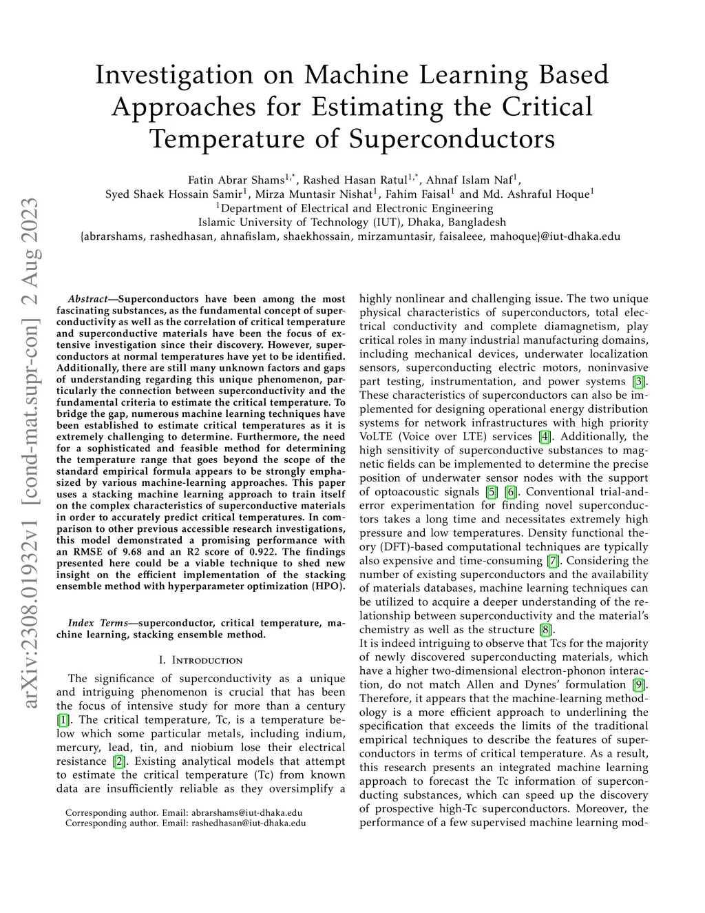 Superconductors have been among the most fascinating substances, as the fundamental concept of superconductivity as well as the correlation of critical temperature and superconductive materials have been the focus of extensive investigation since their discovery. However, superconductors at normal temperatures have yet to be identified. Additionally, there are still many unknown factors and gaps of understanding regarding this unique phenomenon, particularly the connection between superconductivity and the fundamental criteria to estimate the critical temperature. To bridge the gap, numerous machine learning techniques have been established to estimate critical temperatures as it is extremely challenging to determine. Furthermore, the need for a sophisticated and feasible method for determining the temperature range that goes beyond the scope of the standard empirical formula appears to be strongly emphasized by various machine-learning approaches. This paper uses a stacking machine learning approach to train itself on the complex characteristics of superconductive materials in order to accurately predict critical temperatures. In comparison to other previous accessible research investigations, this model demonstrated a promising performance with an RMSE of 9.68 and an R2 score of 0.922. The findings presented here could be a viable technique to shed new insight on the efficient implementation of the stacking ensemble method with hyperparameter optimization (HPO).