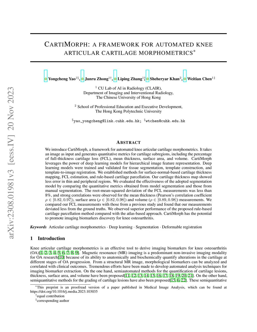 We introduce CartiMorph, a framework for automated knee articular cartilage morphometrics. It takes an image as input and generates quantitative metrics for cartilage subregions, including the percentage of full-thickness cartilage loss (FCL), mean thickness, surface area, and volume. CartiMorph leverages the power of deep learning models for hierarchical image feature representation. Deep learning models were trained and validated for tissue segmentation, template construction, and template-to-image registration. We established methods for surface-normal-based cartilage thickness mapping, FCL estimation, and rule-based cartilage parcellation. Our cartilage thickness map showed less error in thin and peripheral regions. We evaluated the effectiveness of the adopted segmentation model by comparing the quantitative metrics obtained from model segmentation and those from manual segmentation. The root-mean-squared deviation of the FCL measurements was less than 8%, and strong correlations were observed for the mean thickness (Pearson's correlation coefficient ), surface area () and volume () measurements. We compared our FCL measurements with those from a previous study and found that our measurements deviated less from the ground truths. We observed superior performance of the proposed rule-based cartilage parcellation method compared with the atlas-based approach. CartiMorph has the potential to promote imaging biomarkers discovery for knee osteoarthritis.