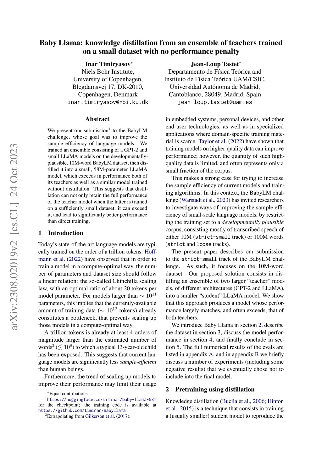 Baby Llama: knowledge distillation from an ensemble of teachers trained