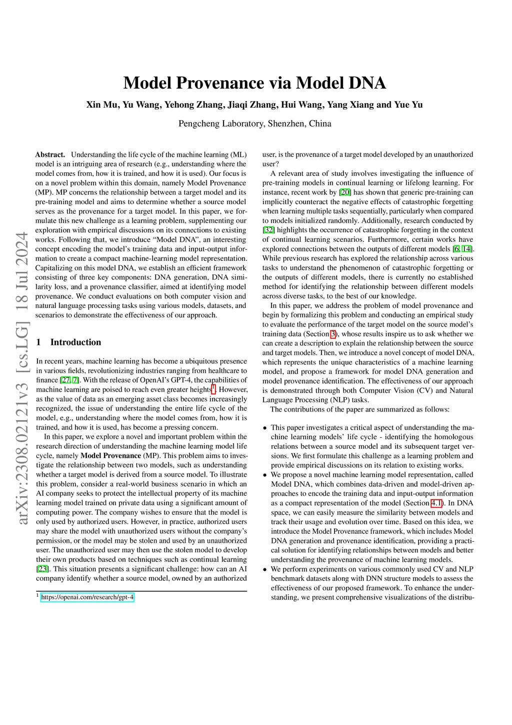 Understanding the life cycle of the machine learning (ML) model is an intriguing area of research (e.g., understanding where the model comes from, how it is trained, and how it is used). This paper focuses on a novel problem within this field, namely Model Provenance (MP), which concerns the relationship between a target model and its pre-training model and aims to determine whether a source model serves as the provenance for a target model. This is an important problem that has significant implications for ensuring the security and intellectual property of machine learning models but has not received much attention in the literature. To fill in this gap, we introduce a novel concept of Model DNA which represents the unique characteristics of a machine learning model. We utilize a data-driven and model-driven representation learning method to encode the model's training data and input-output information as a compact and comprehensive representation (i.e., DNA) of the model. Using this model DNA, we develop an efficient framework for model provenance identification, which enables us to identify whether a source model is a pre-training model of a target model. We conduct evaluations on both computer vision and natural language processing tasks using various models, datasets, and scenarios to demonstrate the effectiveness of our approach in accurately identifying model provenance.