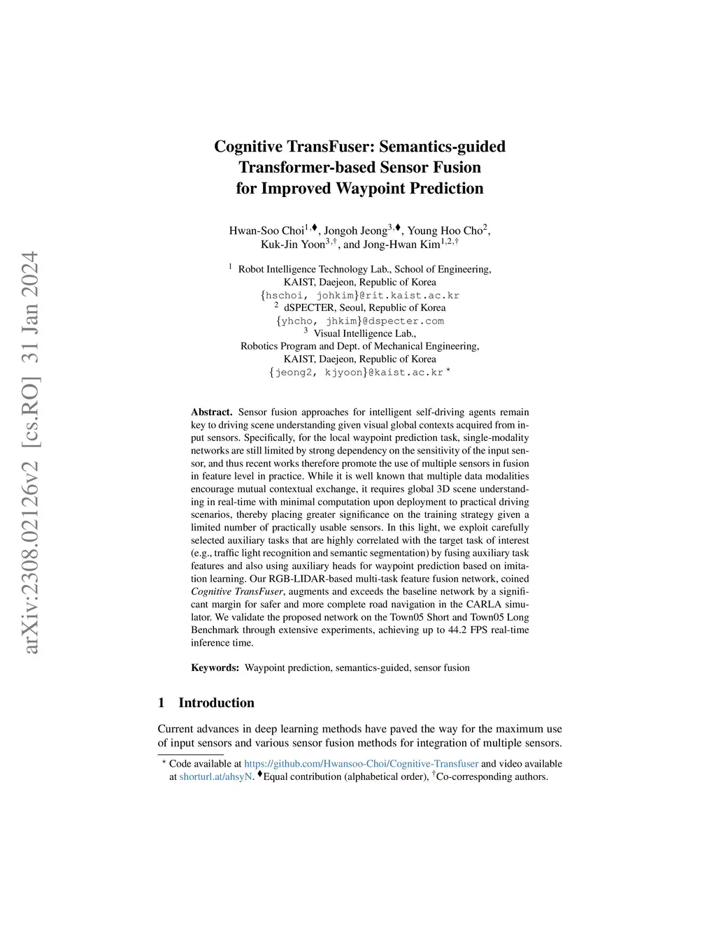 Cognitive TransFuser: Semantics-guided Transformer-based Sensor Fusion