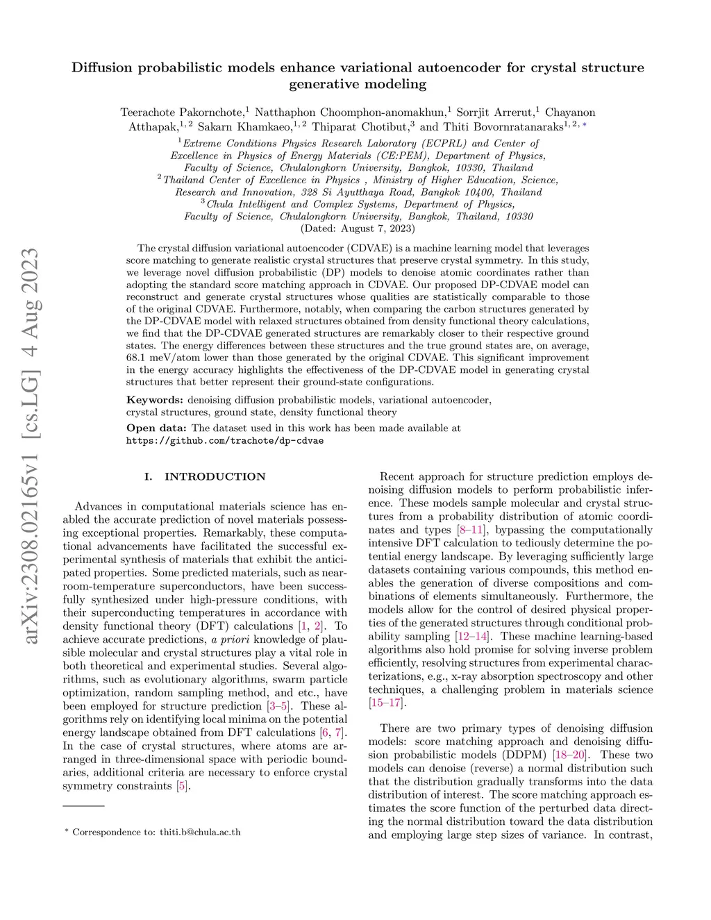 The crystal diffusion variational autoencoder (CDVAE) is a machine learning model that leverages score matching to generate realistic crystal structures that preserve crystal symmetry. In this study, we leverage novel diffusion probabilistic (DP) models to denoise atomic coordinates rather than adopting the standard score matching approach in CDVAE. Our proposed DP-CDVAE model can reconstruct and generate crystal structures whose qualities are statistically comparable to those of the original CDVAE. Furthermore, notably, when comparing the carbon structures generated by the DP-CDVAE model with relaxed structures obtained from density functional theory calculations, we find that the DP-CDVAE generated structures are remarkably closer to their respective ground states. The energy differences between these structures and the true ground states are, on average, 68.1 meV/atom lower than those generated by the original CDVAE. This significant improvement in the energy accuracy highlights the effectiveness of the DP-CDVAE model in generating crystal structures that better represent their ground-state configurations.